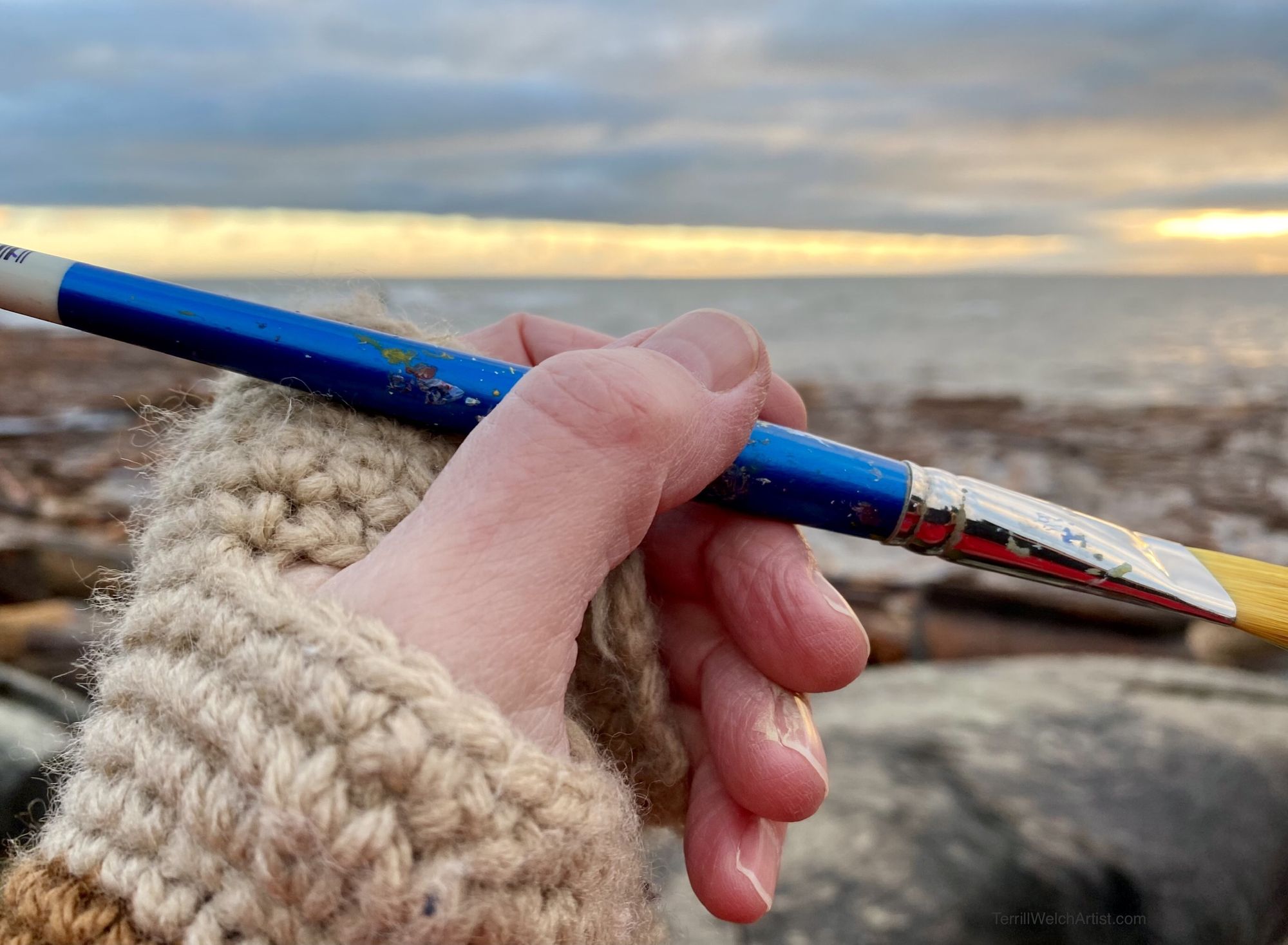 It is bit nippy for standing around painting with a slight breeze and only 4 degrees Celsius so we made it quick. A friend makes these amazing fingerless gloves that I use when plein air painting during our west coast winters. They work extremely well for keeping my fingers flexible in the cold.