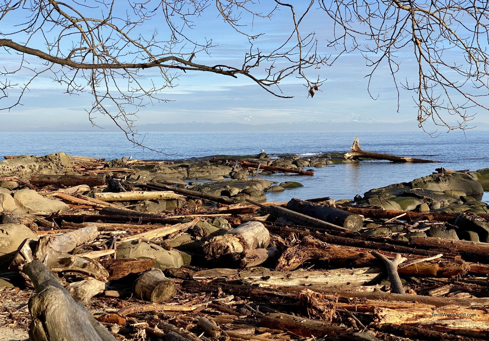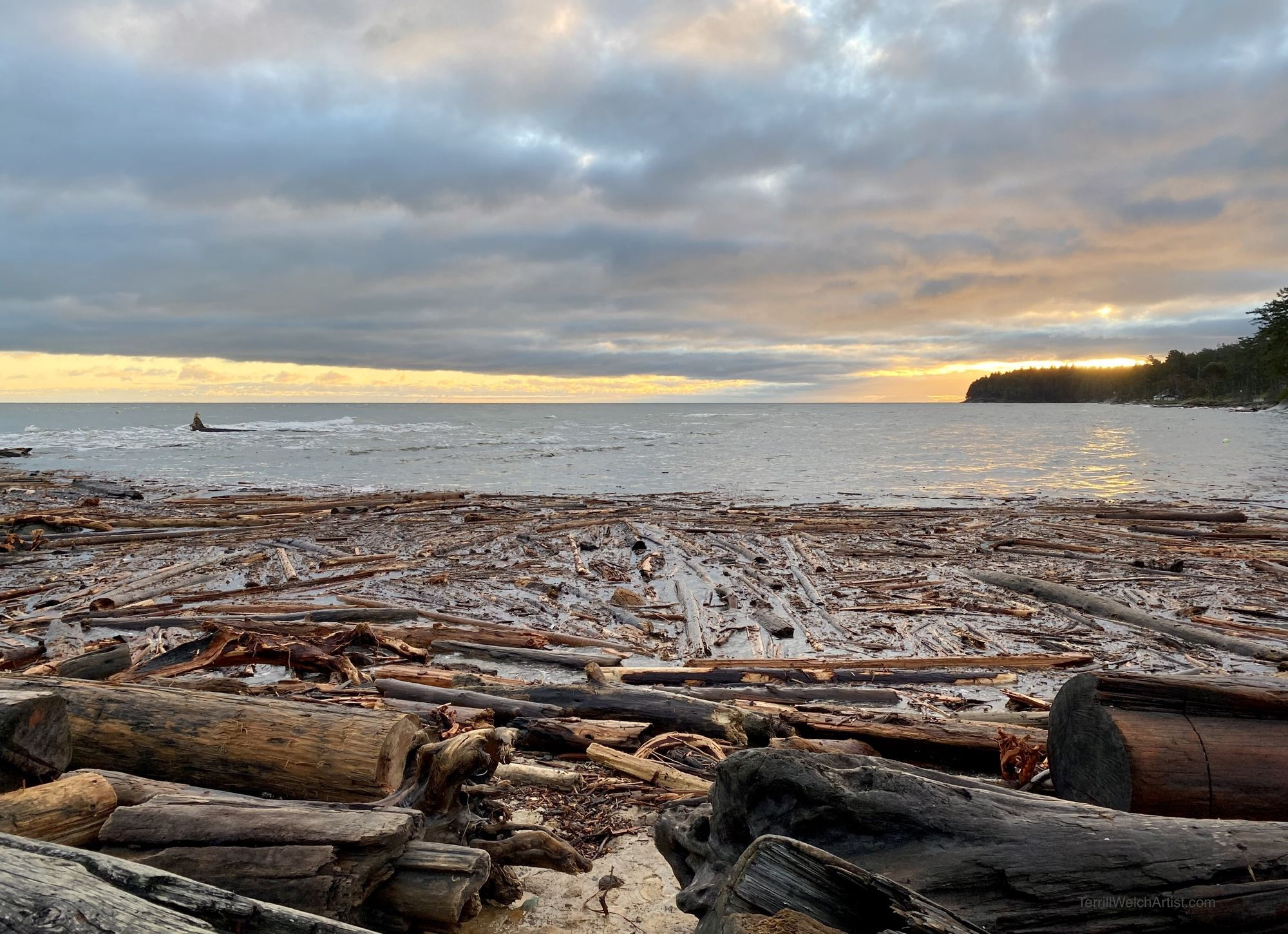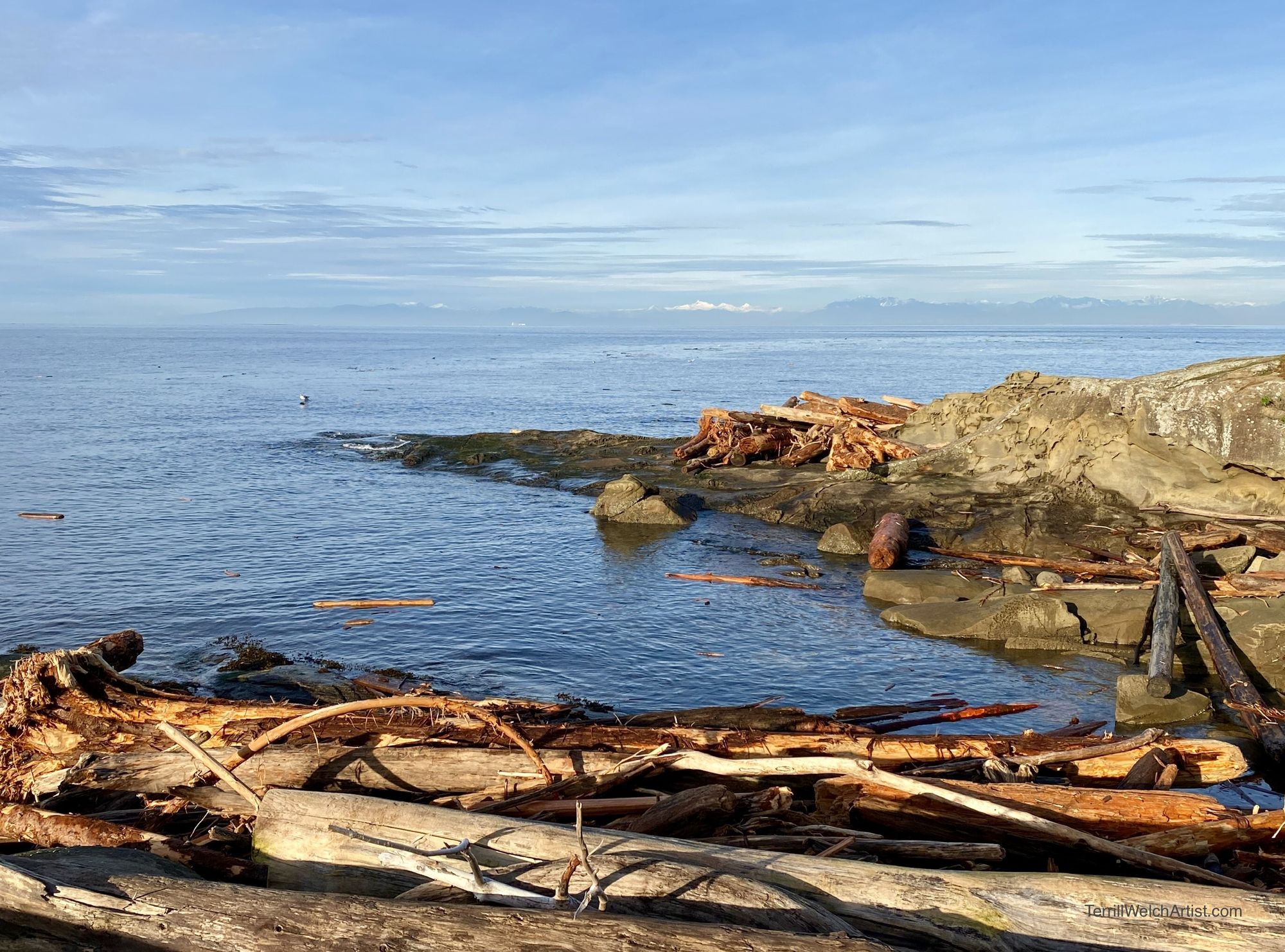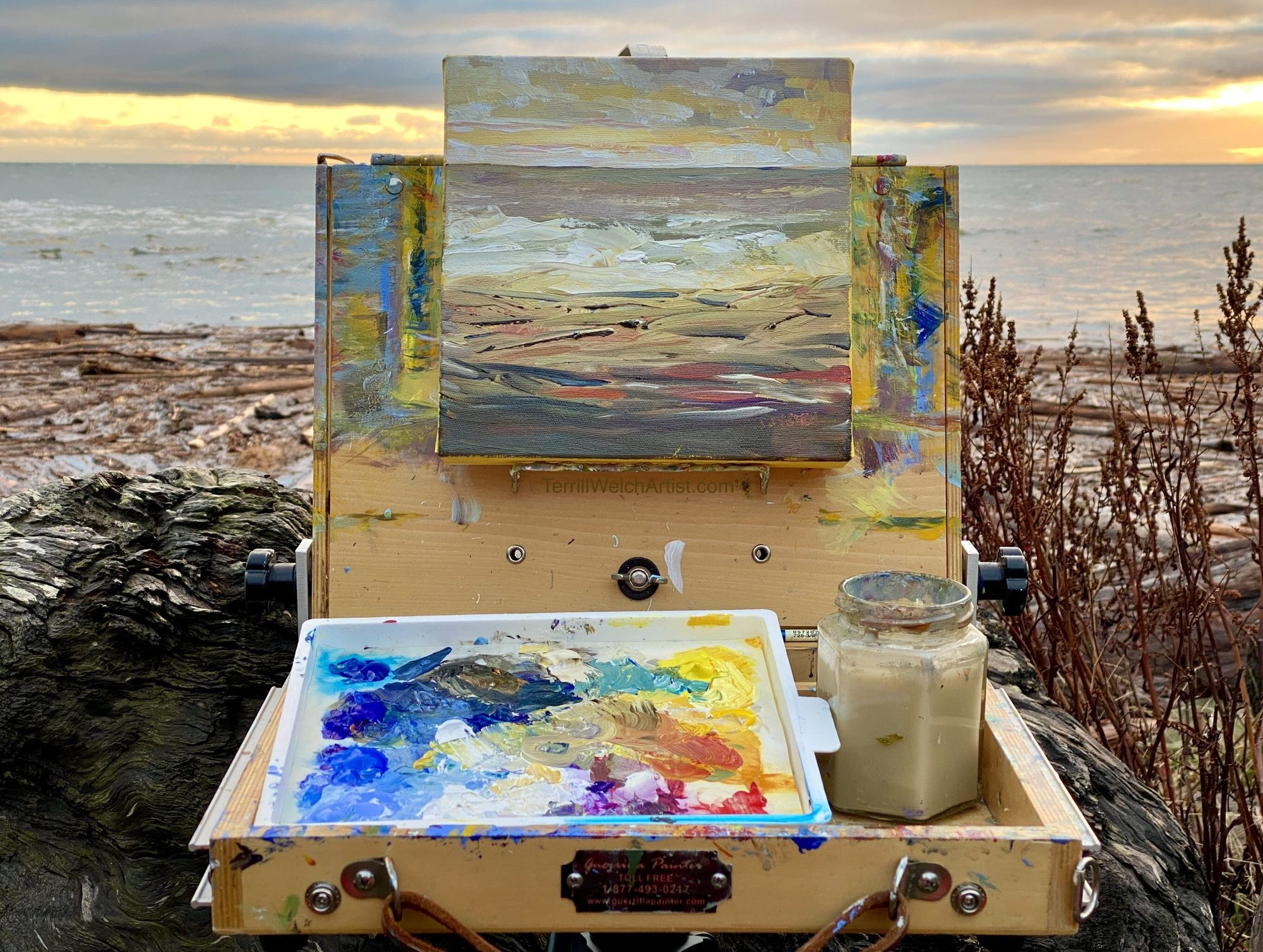 Plein air mornings at Reef Bay for sunrise are the best! The sun is rising way off on the right in the southeast right now and the light bounces right across the Strait of Georgia. Plus, it is not so early to catch it. I am there shortly after 7:00 and all set up to paint by 7:20. Sunrise is at 7:29 am PDT. This was taken at 7:55 am. A painter has to be fast if they want to render a plein air sunrise. 😉
