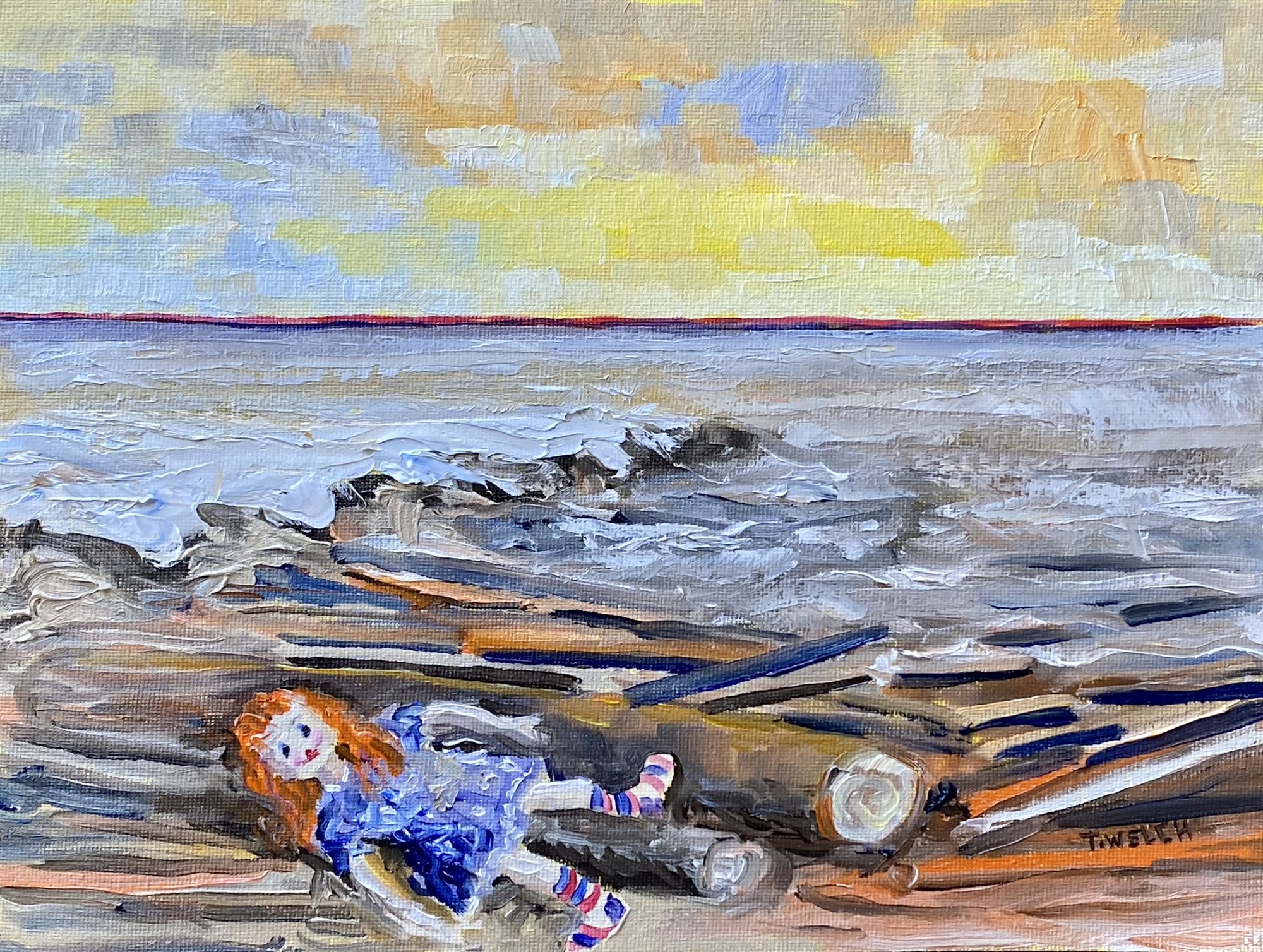 There is a deliberate ambiguity of scale and content in this painting. We do not know the actual size of the the logs or the raggedy Anne doll which are sometimes bigger than the children that pack them around. We don’t know if it is even a doll or if its muddy and surf-battered existence is actually an unintended emotional self portrait of the painter. I suspect the latter but I am too close to the painting to be certain. The water has a heavy quality that was purposefully left as a reference to the effort that is required of the sea to clean and absorb this recent weather disaster. The only preplanning for this painting was to measure in the horizon line and I knew from the start this would be another in my Red Line series.