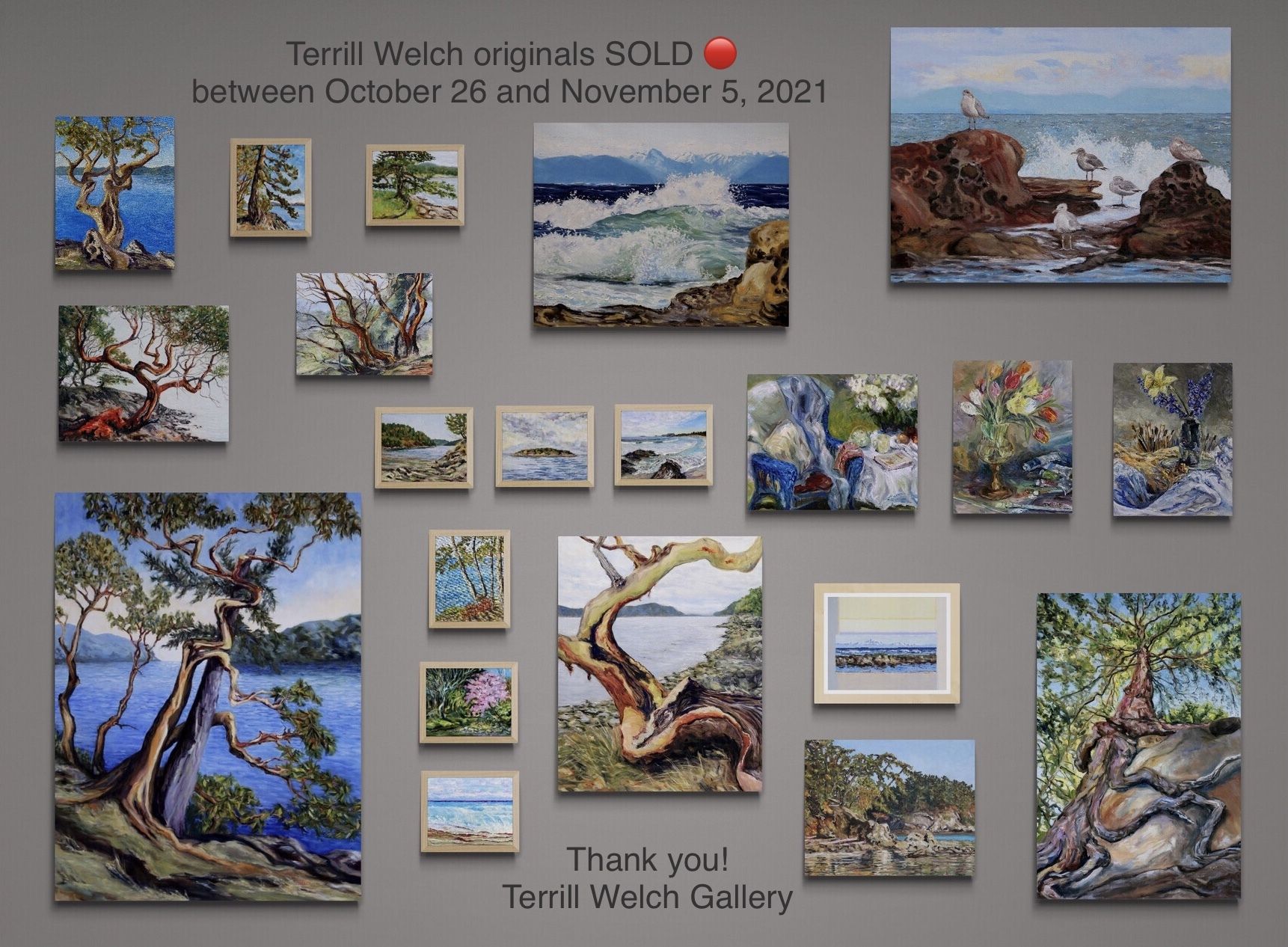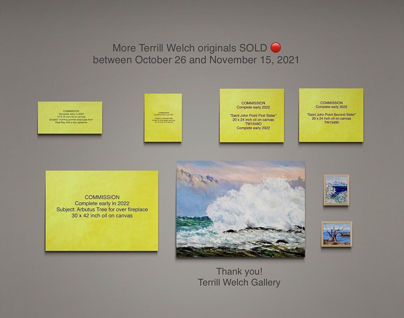 Now for the final collage of sold “Terrill Welch original paintings”! In total, 29 paintings have been committed to or taken into the care and custody of long time art collectors and serious fans between October 26th and November 15th of 2021. That is 29 paintings sold within less than a month! This includes 24 existing paintings (though one was painted immediately to accommodate a gift) and five commissions that you will see here represented to scale by a yellow ground and notes about each one.