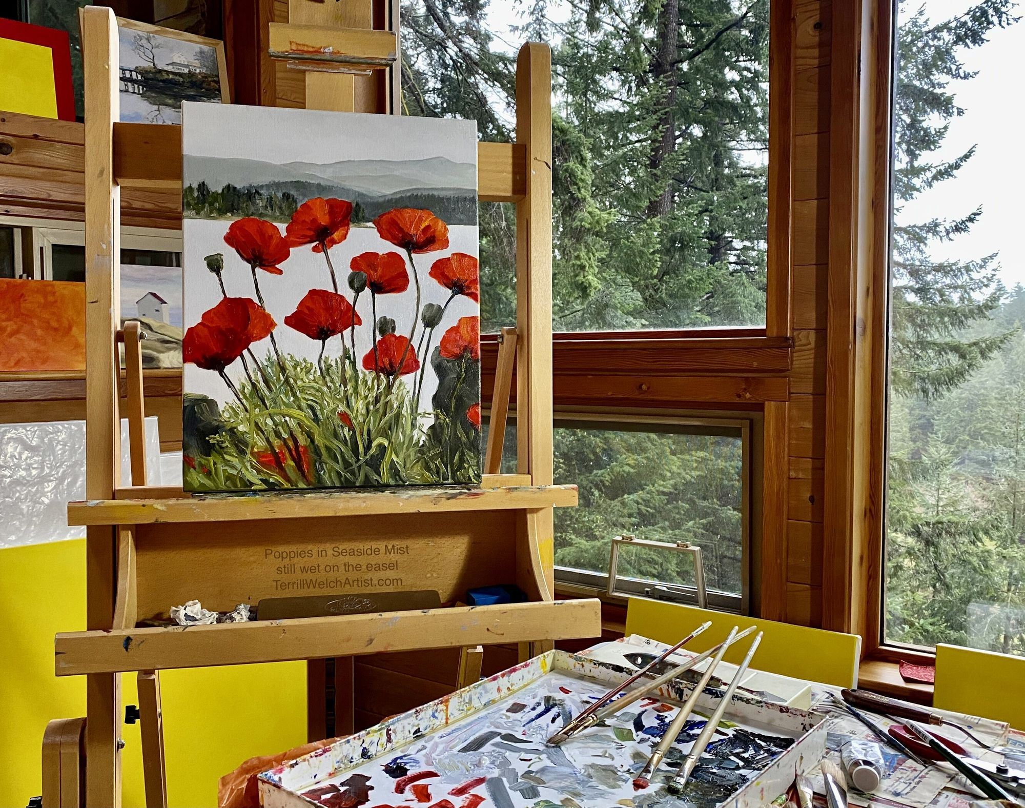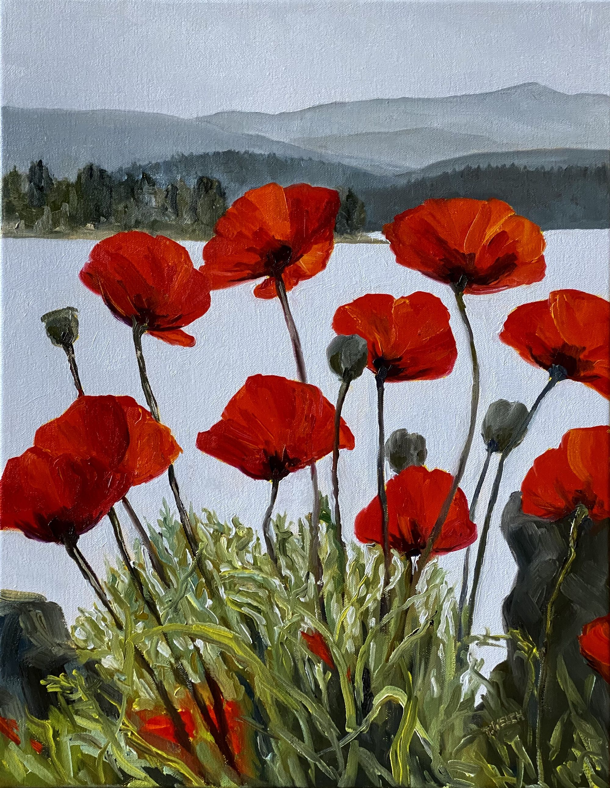 The weather outside and that in the painting are a perfect pairing. I remember catching a brief break in the rain to get the references of these poppies on Galiano Island and this is the third time I have painted them. As with the second time, this too is a commission.