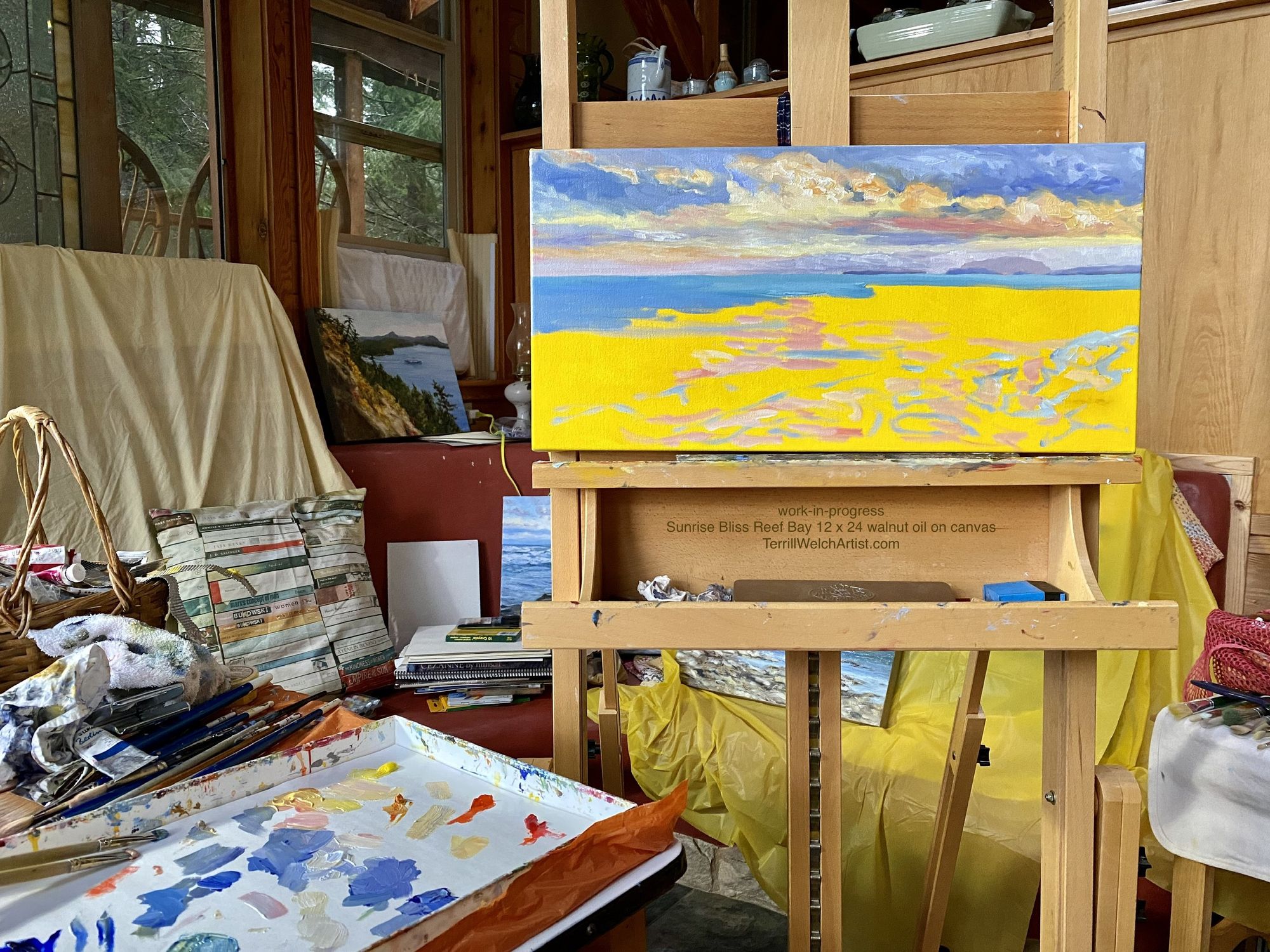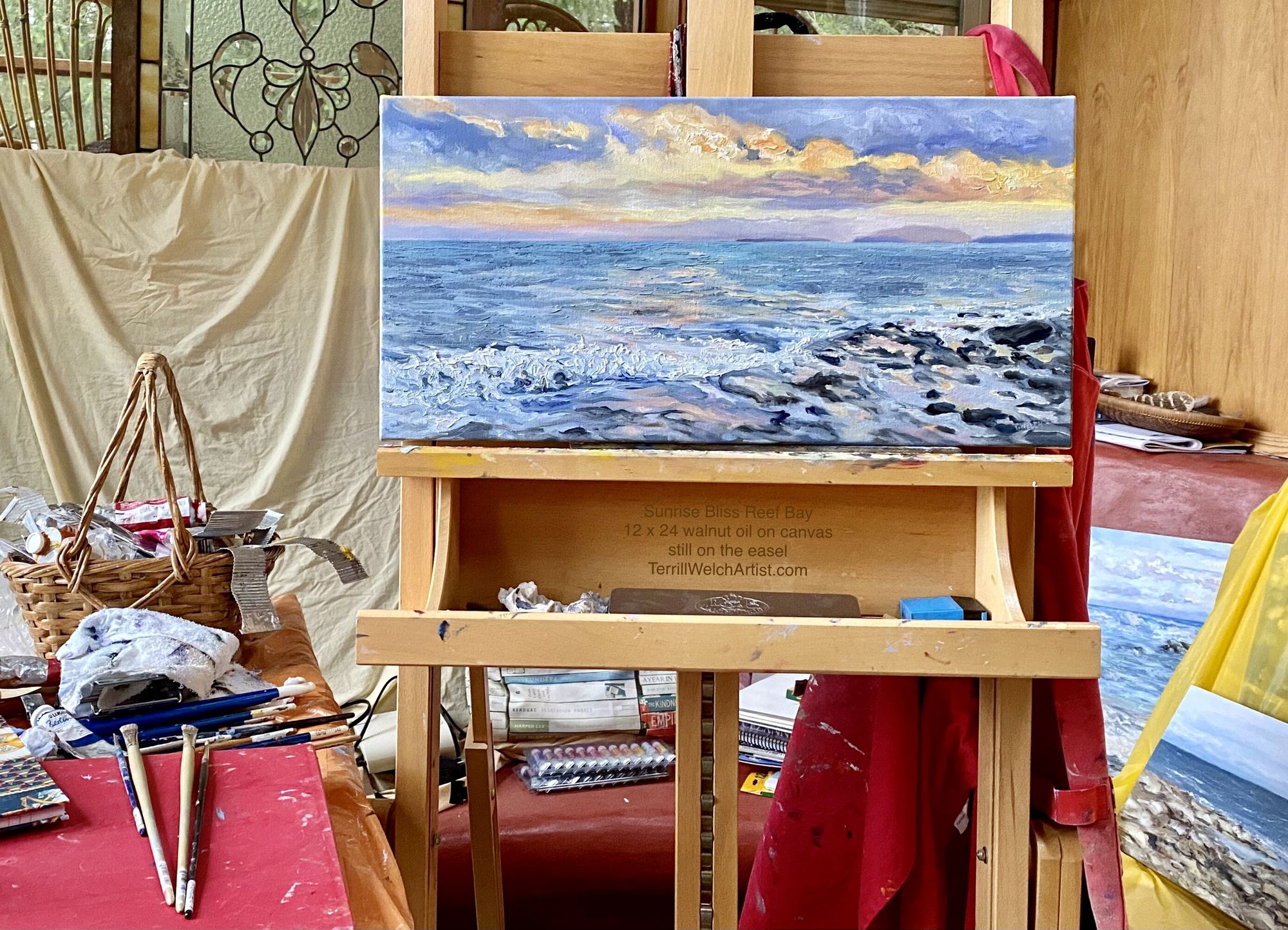 Canadian painter Robert Genn used to tell his daughter Sara Genn (who is also a painter) that it was ideal to leave something on the easel unfinished at the end of the day so that you would wake up with a place to start in the morning. I was reminded of this the other night as I was trying to push through with a studio lamp only to finally have to stop because I could no longer see the hues clearly. I had the next commissioned painting of a sunrise at Reef Bay is started on the easel.