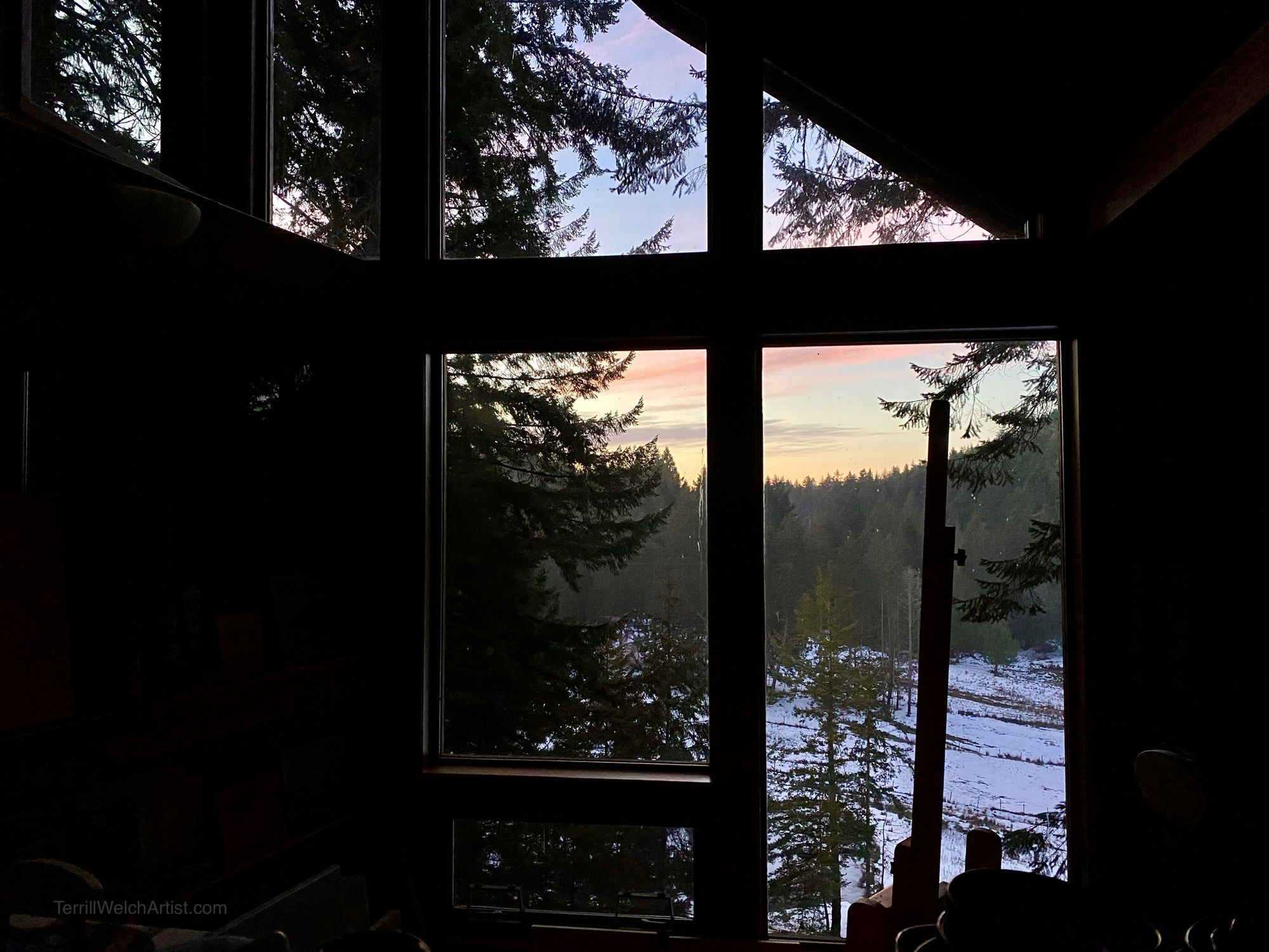 Fog and mist shroud the island as temperatures rise to above eight degrees celsius. With the days getting slightly longer and the snow melted, it feels more like proper southwest coast winter and studio painting weather. On the edge of a cliff, flanked by tall firs with windows on three sides, it has felt like my easel has been suspended in mist. With this less-than-ideal south exposure, these conditions are actually beautiful light to paint under. So let’s see what we have…