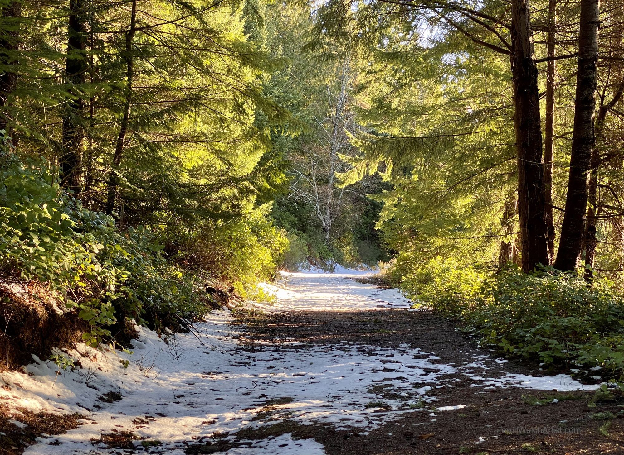 The trail still has some snow left but it is warm enough to be melting and the light patterns are delightful.