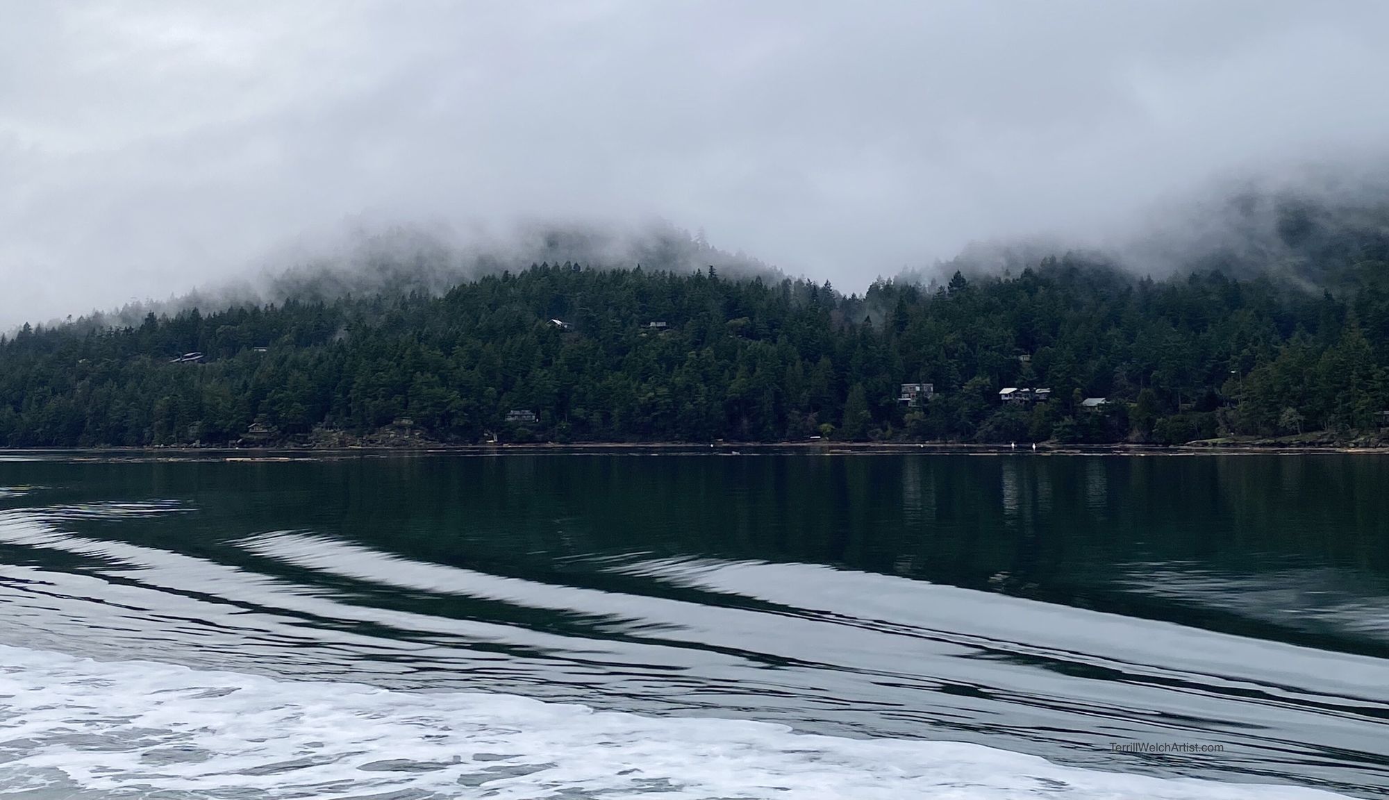 We are right at the back of the ferry looking out at where we have just been. The islands are still shrouded in an insistent fog that has been keeping us company for days.