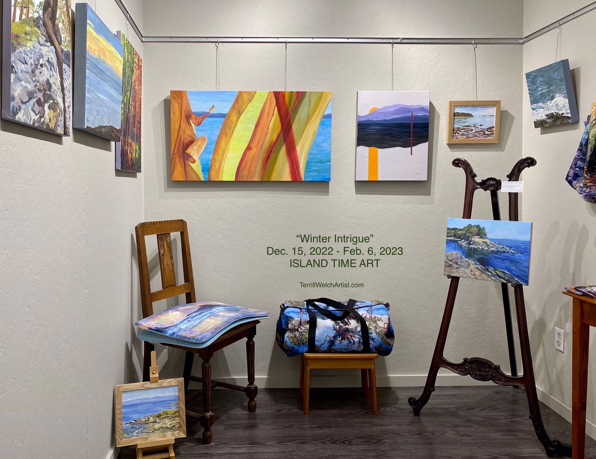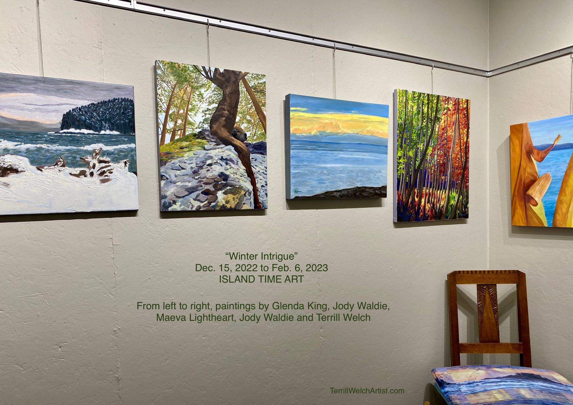 From 10 - 5 Thursday to Monday, December 15, 2022 to February 6, 2023 the ISLAND TIME ART room at 492 Dalton Rd. on Mayne Island will present “Winter Intrigue” with soft and bright original paintings of various sizes by Jody Waldie, Jennifer Peers, Glenda King, Maeva Lightheart and Terrill Welch. These artworks can also be purchased online in our private viewing room.