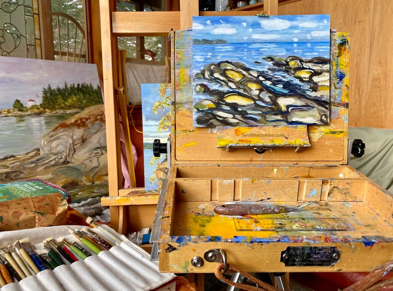 And "Sandstone Serpents at the Entrance to Active Pass" by Terrill Welch 8 x 10 inch acrylic and pencil crayon on gessobord.