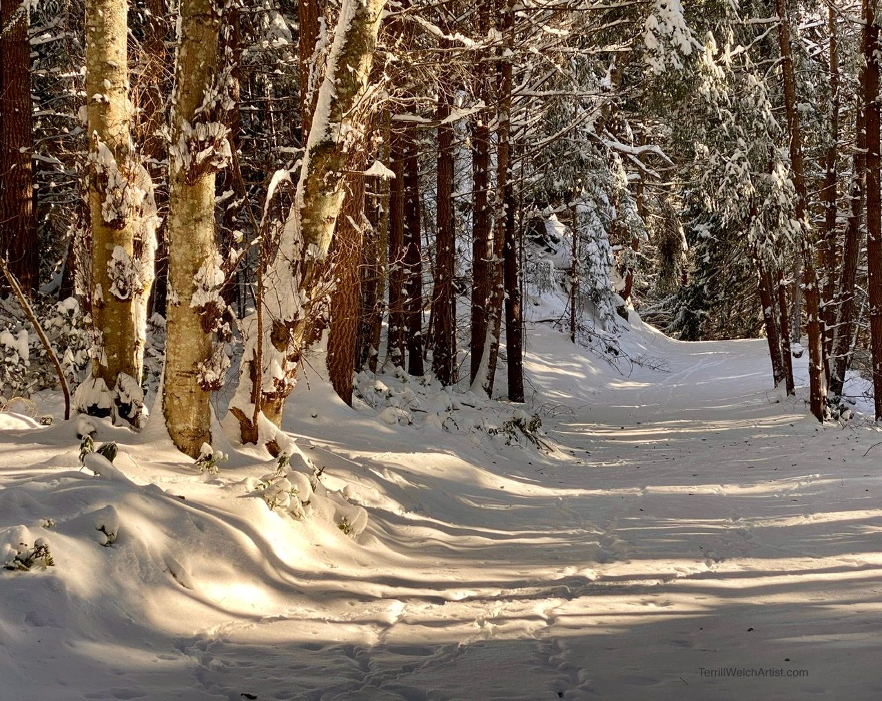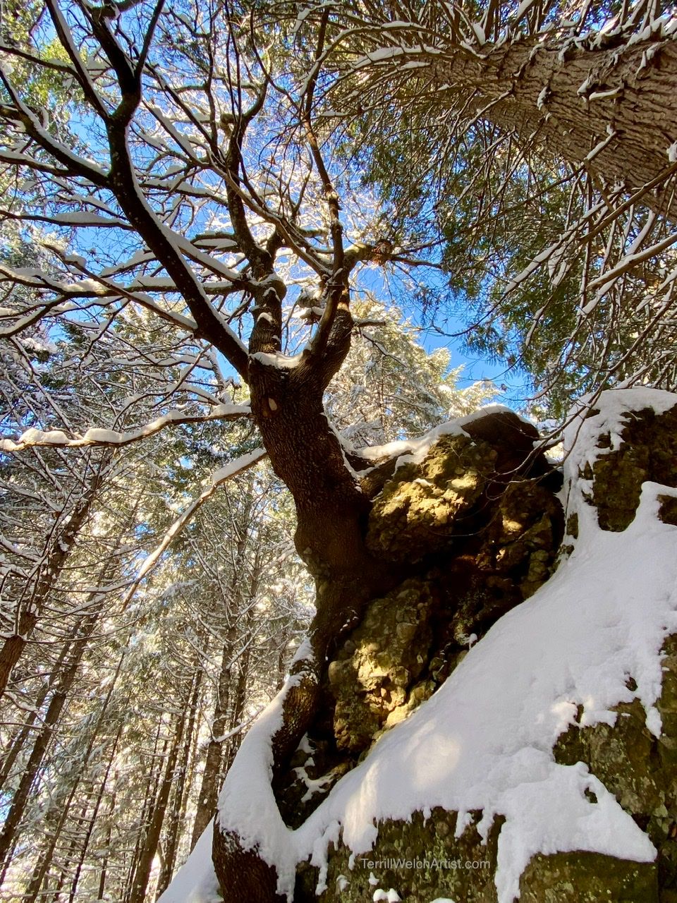 My walking friend turned back with both of us smiling and feeling much better for the visit and time in the forest. Shortly after this, I meet my other two friends with their dogs and the eggs and milk. We chatted and admired the snow falling from the trees for a couple of minutes. Then I started back home with one quick stop beside a favourite Maple tree.