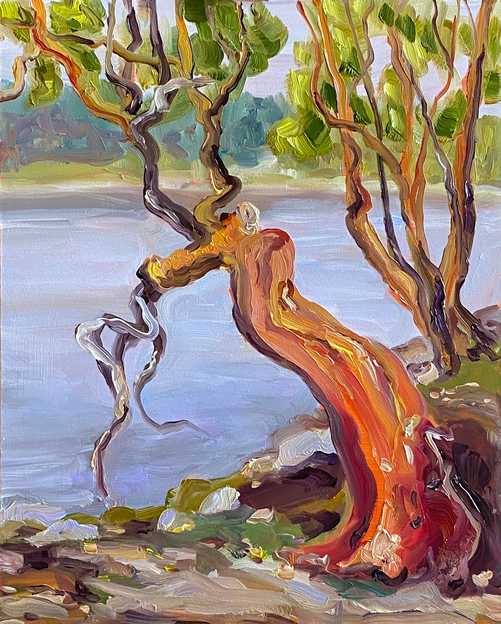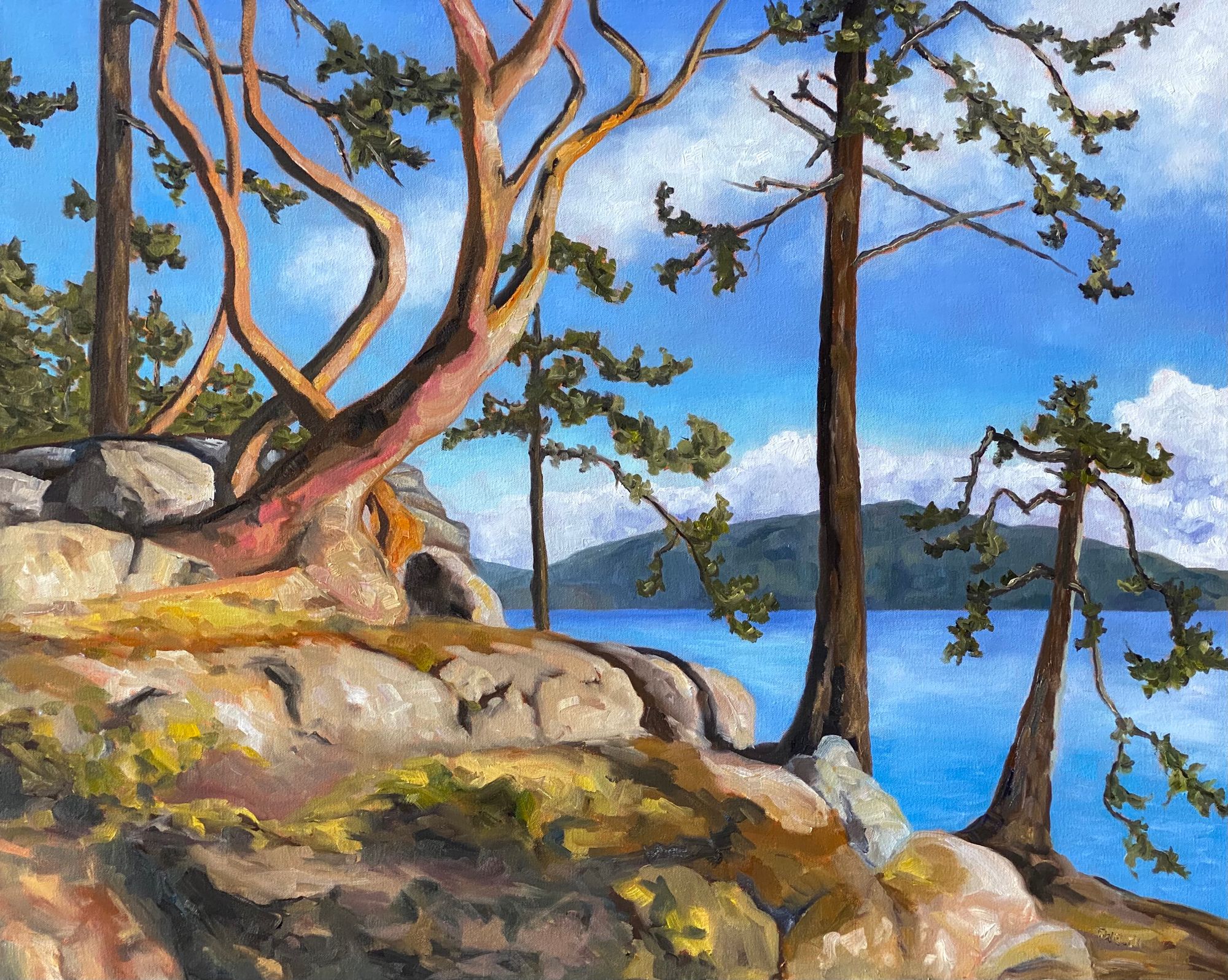 Artist notes: Leaning over Bennett Bay, the Arbutus tree calmly invites me into its view. Stay a while it seems to say just as a raven calls over head and forest birds chatter in the branches. So I do.