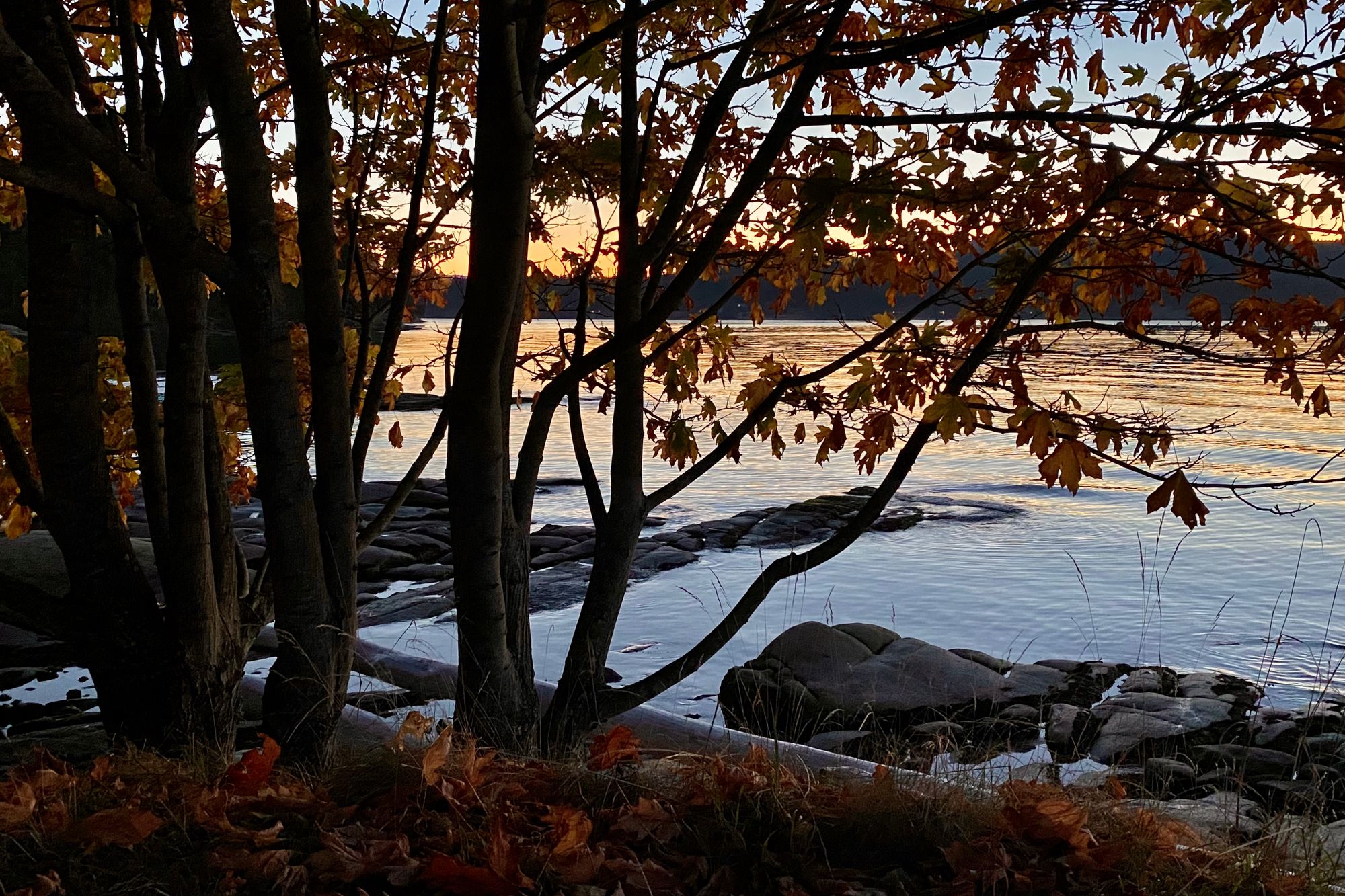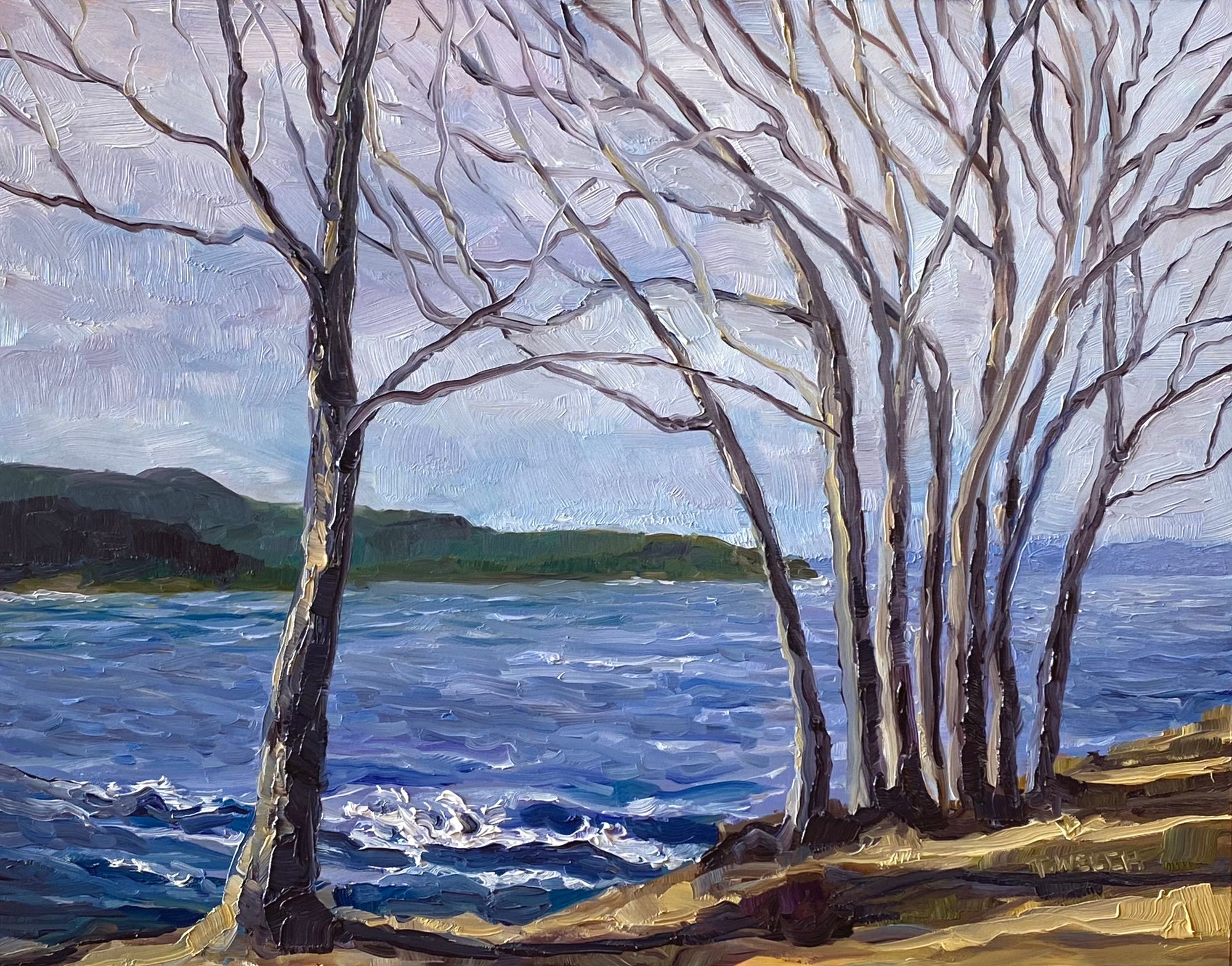 Artist notes: The days are short and the afternoon sun barely reaches around the island hills to the Maple Trees. One must wait until later in the day… but not too late.