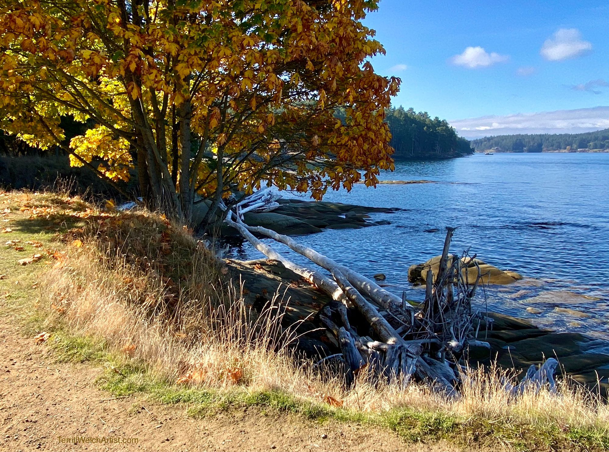 During this past month, between painting, having a new septic system put in and my father having a heart attack and then a successful triple bypass open heart surgery at almost 87 years old, I have also made it out on the trails and down by the sea. My parents are top of mind because when my father had a heart attack, they were still farming and living 43 km outside of the town of Vanderhoof, without electricity, in north central British Columbia. However, our family has scrambled together to get behind them. My younger sister has been with them in Vancouver from shortly after the air ambulance plan landed having come down from Armstrong British Columbia. My youngest brother has taking on what needs doing on the farm, including, at the request of my parents, organizing the shipping and sale of their 60 head of cattle. Other family members pulled together to get them a place to rent close to Vanderhoof with all the usual amenities for this coming winter and moved their belongings. A gate has been installed at the entrance to their property and the farm house will be closed up winterized. My daughter came and stayed with my husband David (who cannot stay by himself overnight any longer) so I could go help out and visit dad and mom in Vancouver for two nights. It wasn’t much time but I was grateful for the opportunity. My son and his partner hosted my mom and sister for several weeks in Vancouver and then me when I went over, along with my nephew for a few days. I am so very grateful that I have the family I have because of how well they work together. My siblings and my children and nieces and nephews as well as aunts and uncles have all stepped up as needed. No one waits to be asked when they can see something that needs to be done. At the same time, no one has a strong opinion that they will stand behind about what mom and dad should or should not do. We research options and follow their lead for what they want to do. Still, it is a difficult time. My parents arrived home this past week, after an air ambulance trip half a province away that was followed by a major surgery, to find themselves moved into a new place to live and their animals sold. We who helped out had and have the easy part of this adventure. Now dad must heal over the winter and they both need to adjust, absorb and regroup from these major life altering events. This is where I can be key part of their support due to the fact that I have a long standing Saturday morning phone call with them. Needless to say, nature walks have been more significant to me than usual.
