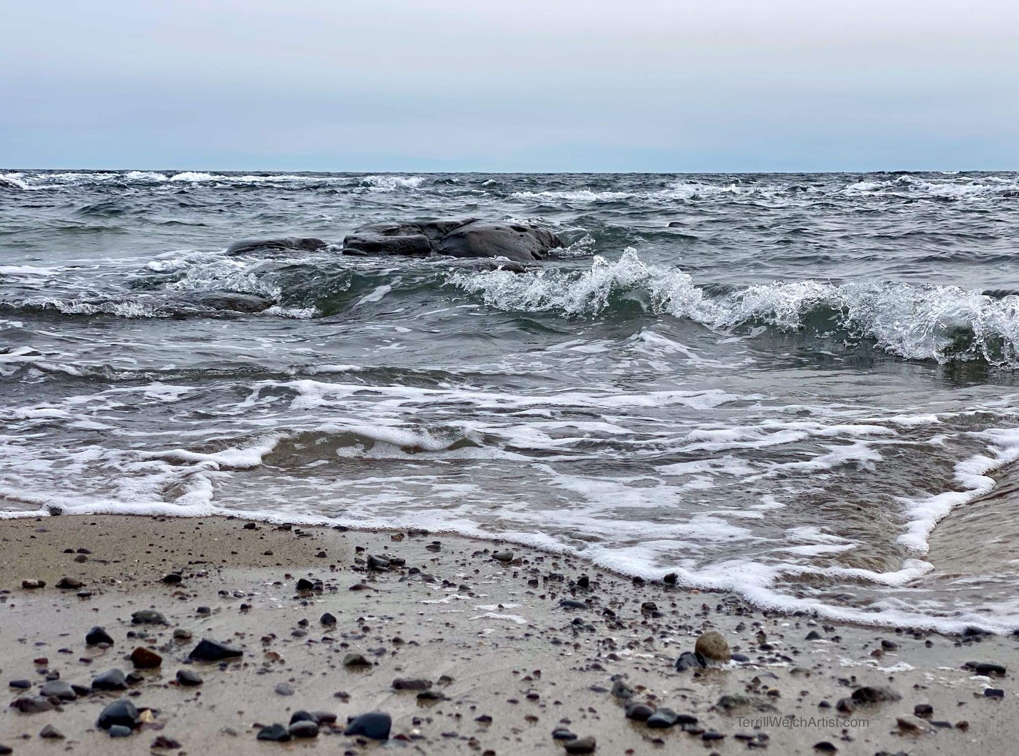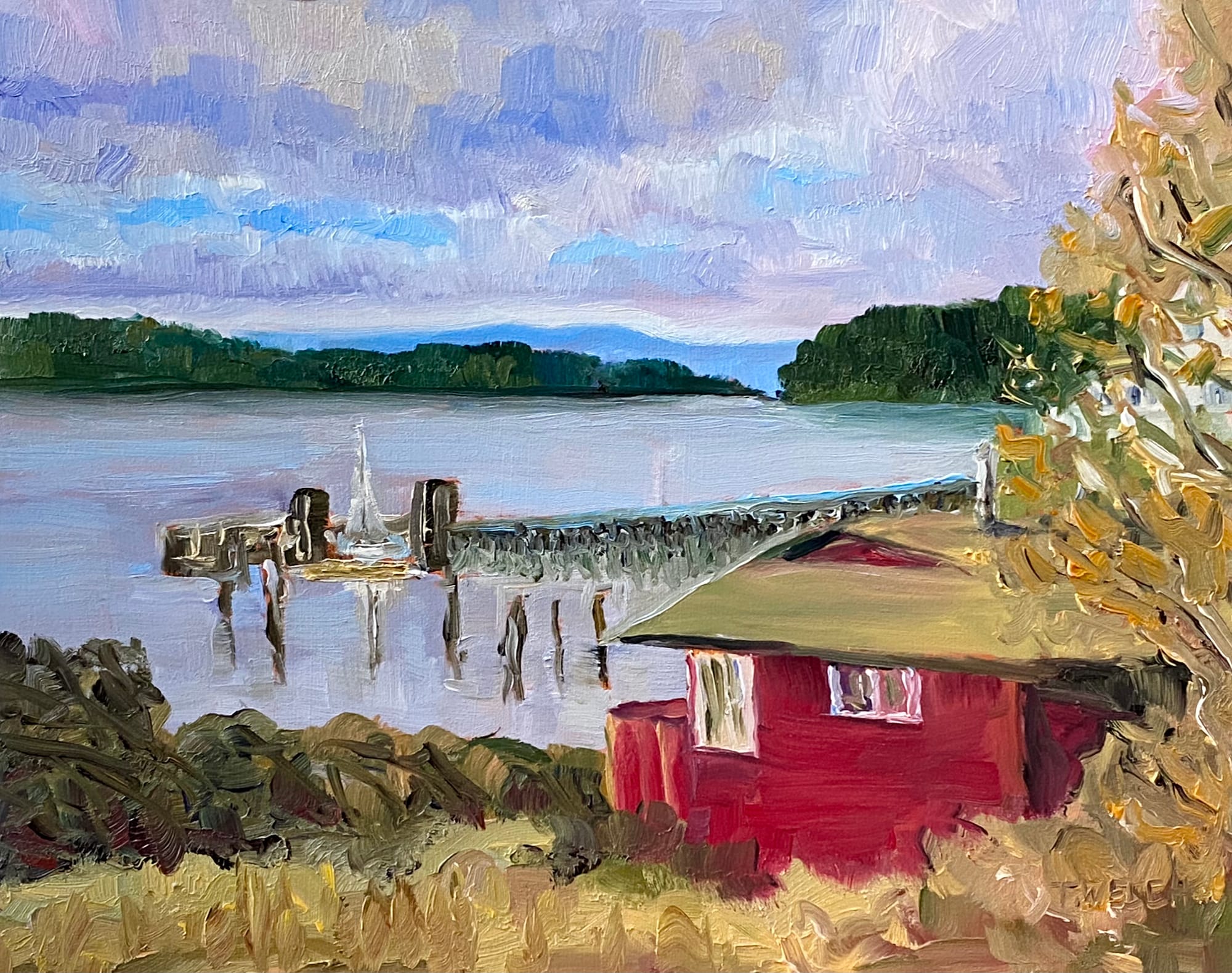 Artist notes: Breaking clouds in January afternoon light push back against the hunched barn red cabin in Miners Bay. Details are few as my eye flutters back and forth across the view.