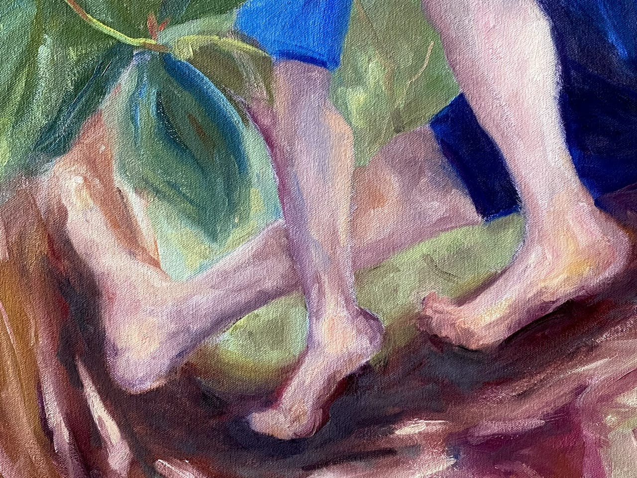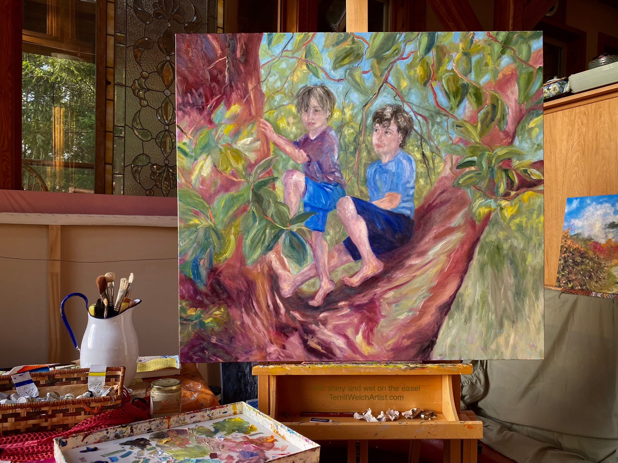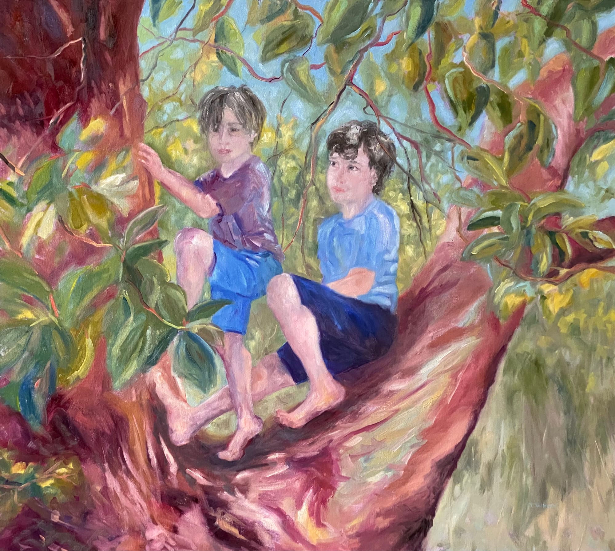 Artist notes: It is warm during the midday in the July 2020 sun. This is the first year of the Covid pandemic and we are spending time together in the park outside. After a picnic lunch we go for a walk and the boys found an arbutus tree to climb. They are older now but memories are sometimes worth putting on a canvas.