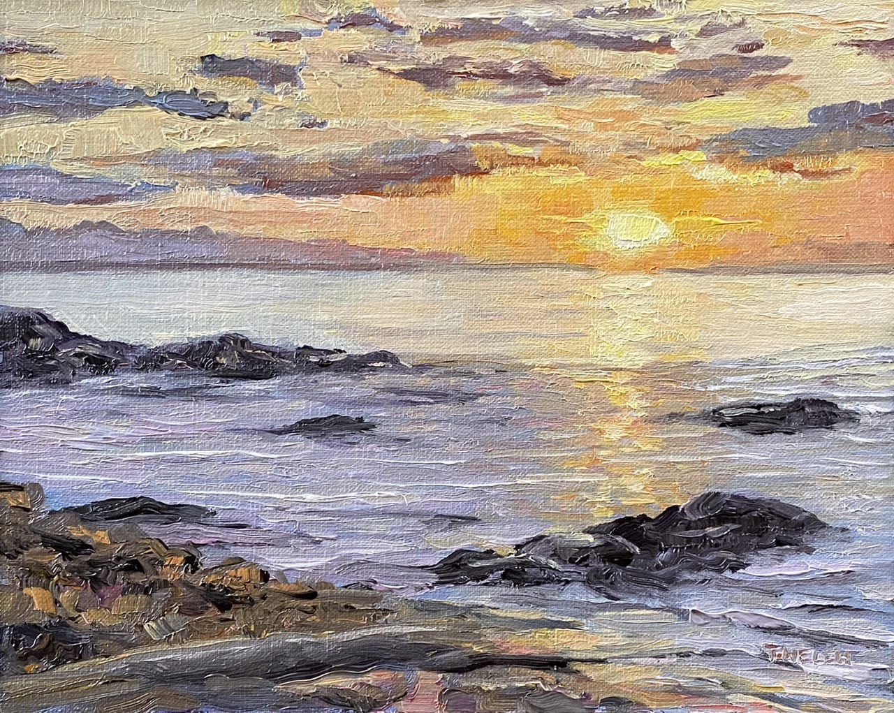 Artist notes: The light is just starting to hang itself on the tips of the tall fir branches outside our windows when I rise. I quickly grind the dark whole beans while the water is boiling and brew coffee to take with me to the beach at Reef Bay. Slipping unnoticed out the door, I am there by 5:30 am, perched and waiting to receive a renewable gift of resilience, hope and possibility in that spectacular phenomena, millions of years older than humanity - sunrise, mid May 2023.
