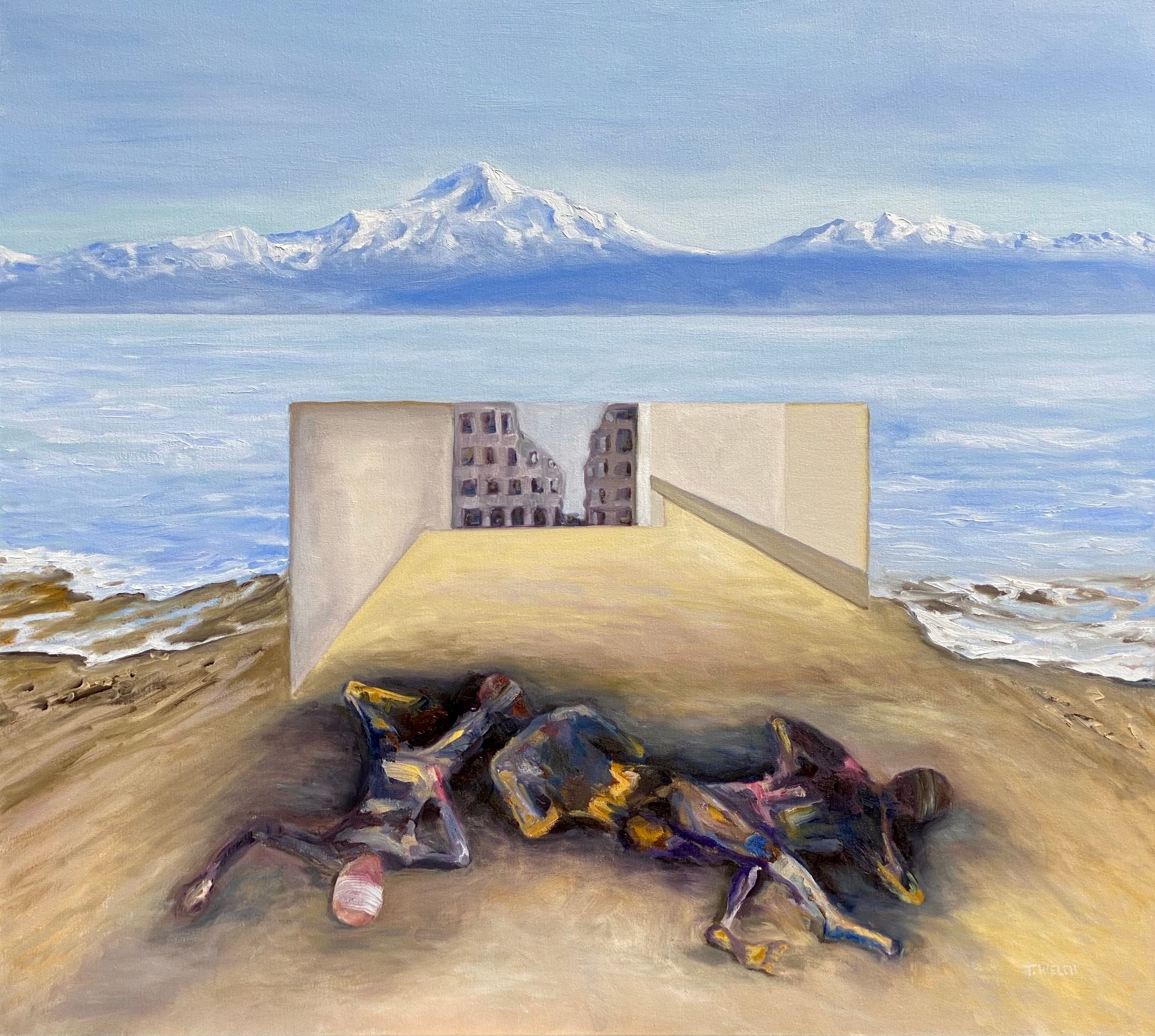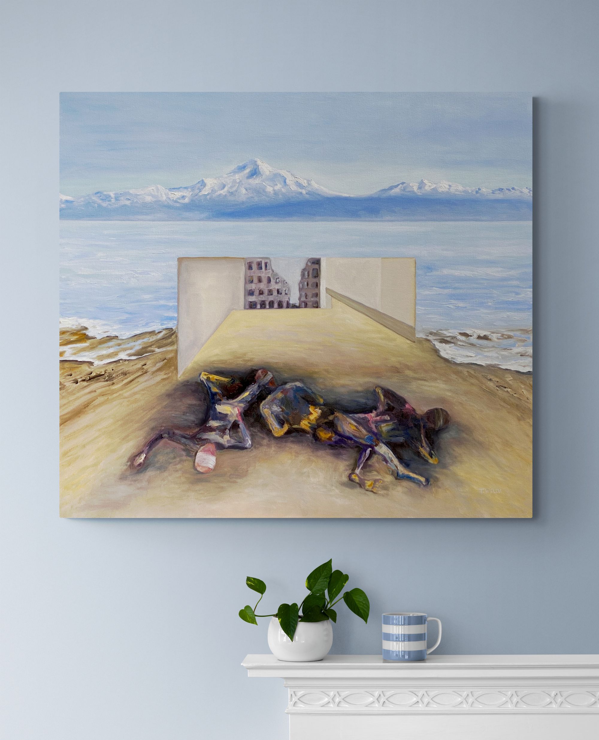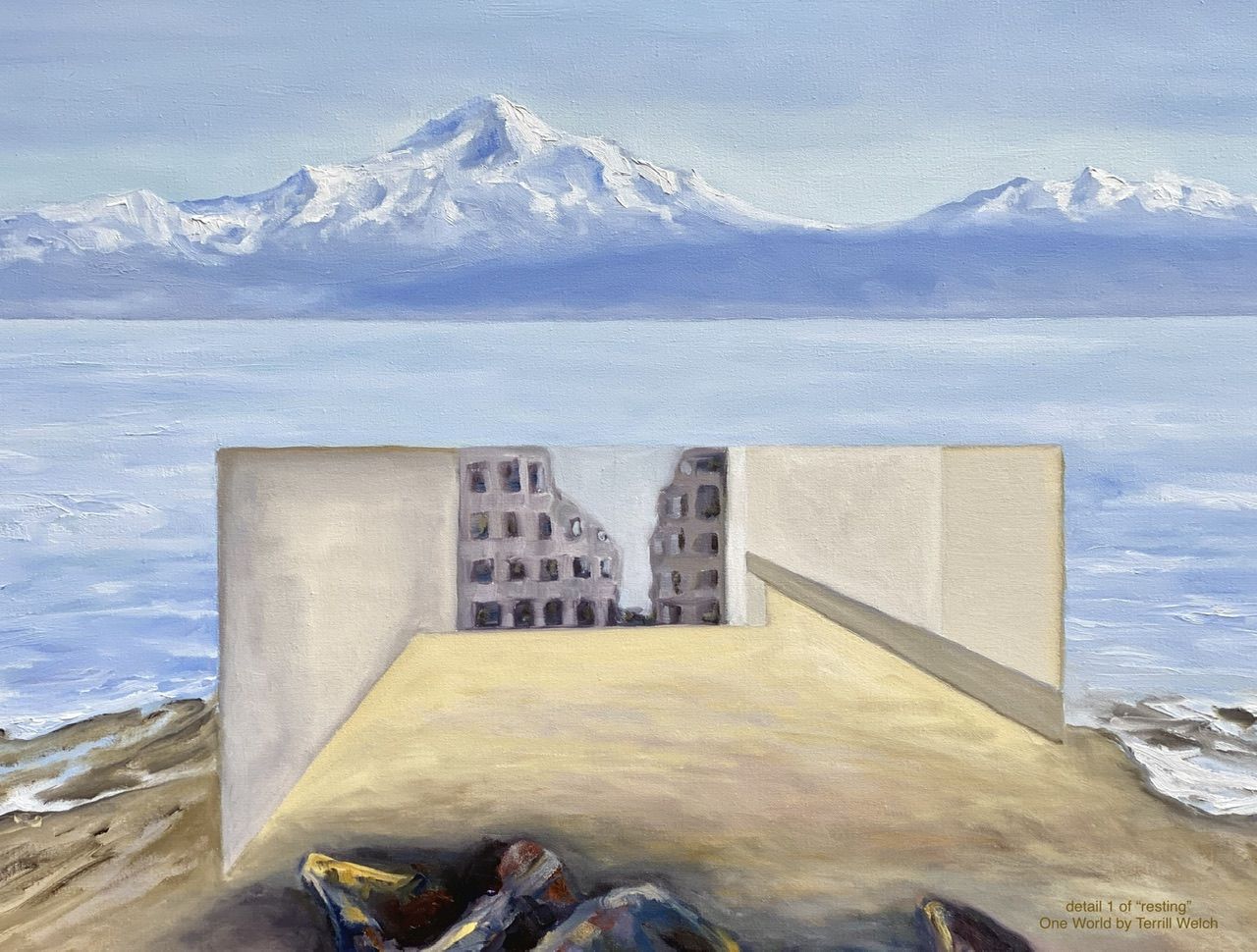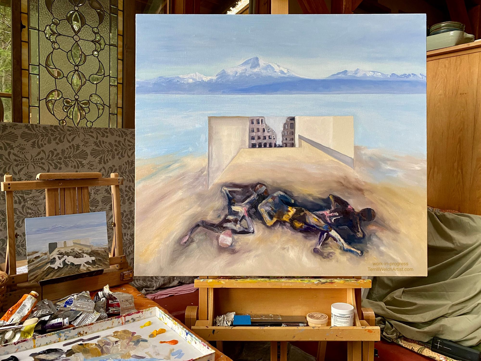 During early April 2022, war photographers began releasing images of Bucha Ukraine following Russia's retreat. The inhumane atrocities were nightmarishly haunting. I was overwhelmed by the graphic realty of sickly human behaviour. I went from our calm, warm, cozy home to the shores of the Salish Sea on the southwest coast of Canada where Mount Baker loomed across the waters in the United States. What if our neighbouring country were to attack us in this way? What would we do? These lands too have witnessed atrocities by European settlers towards Indigenous communities. There is no place of virtue for how despicable humans can be to one another. The miracle might be that we have even moments of peace, compassion and caring at all. Yet, the seascape from my island home is tranquil and takes the edge off of my inner turmoil. I return home and paint “One World, Two Places” using several partial references and my imagination. This painting is not yet released because it is one of my references for the large canvas I am working on now.