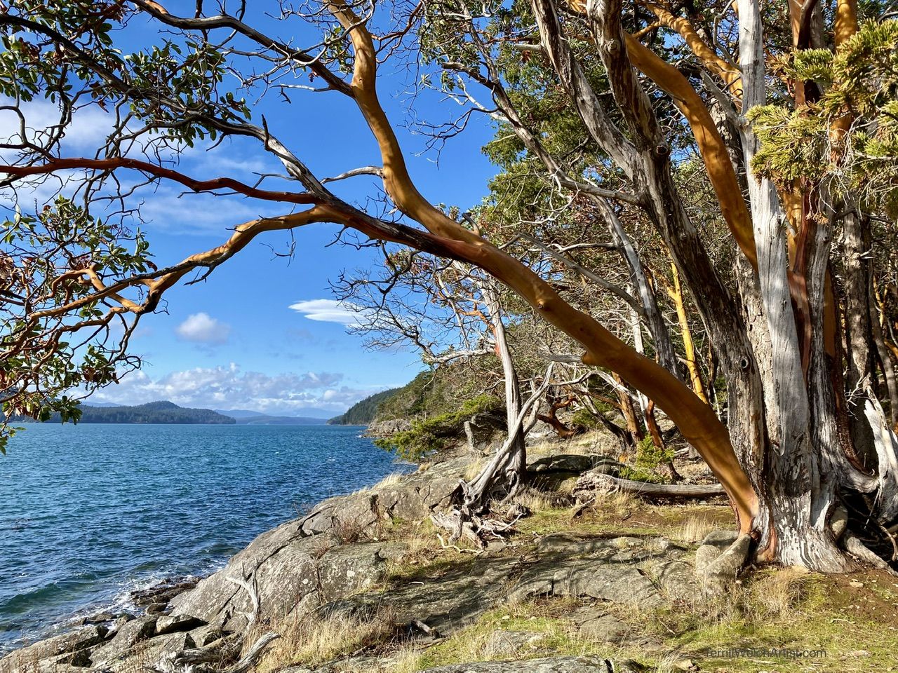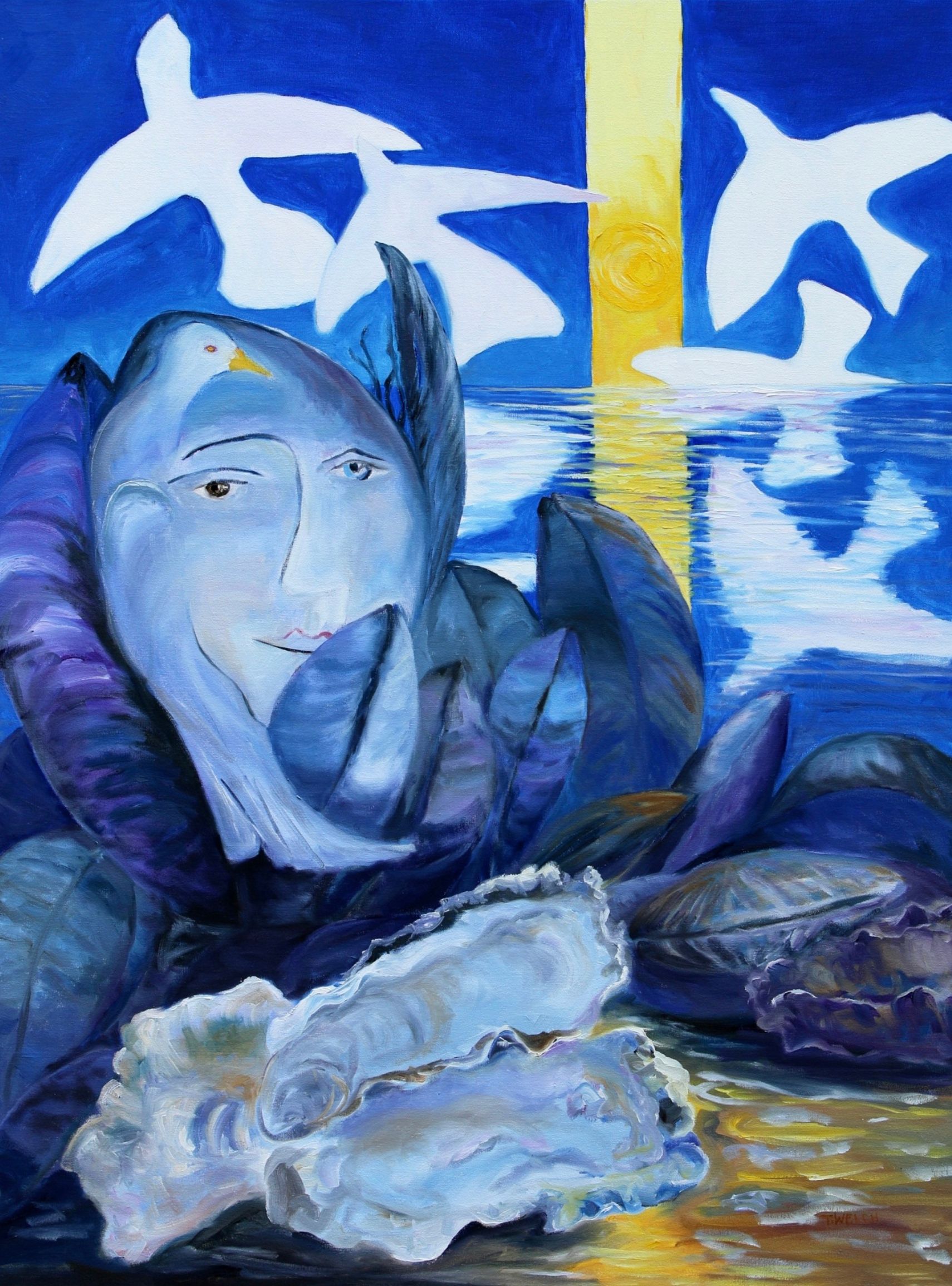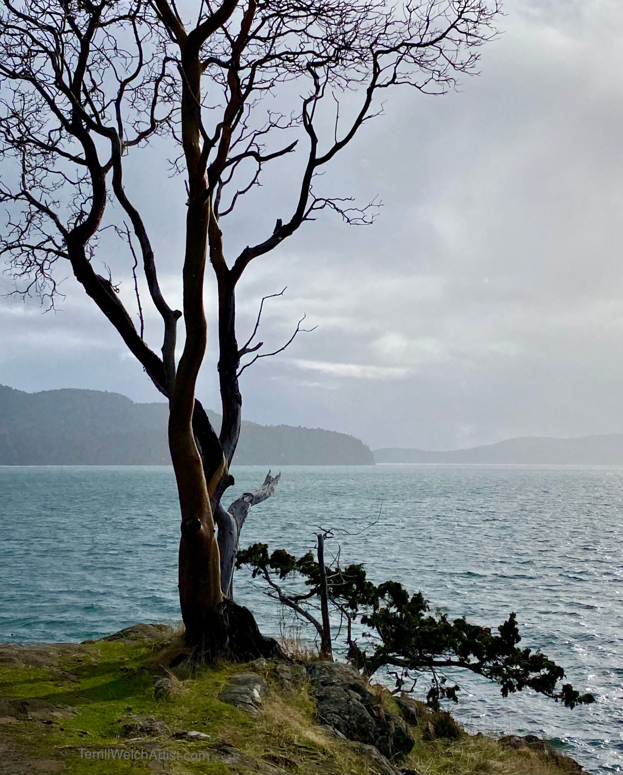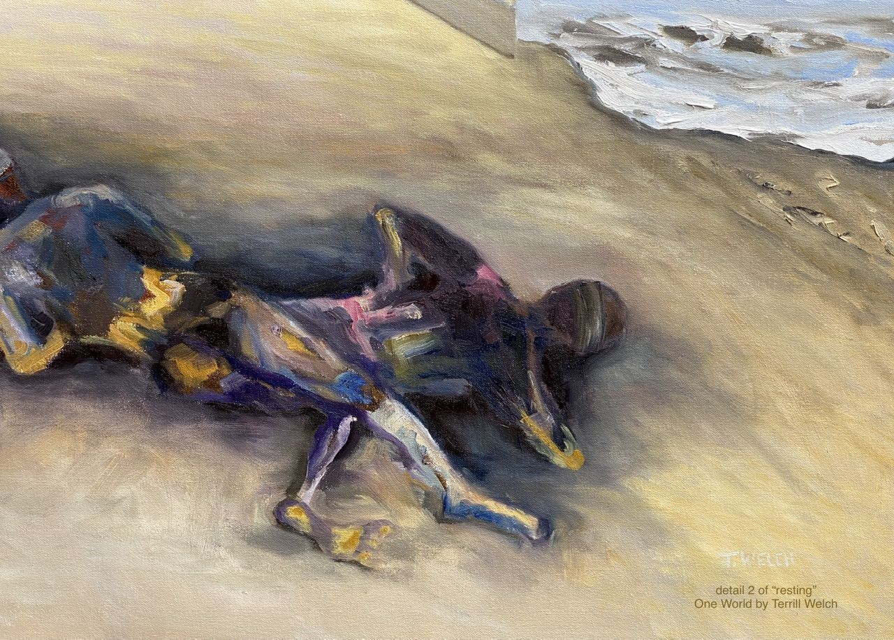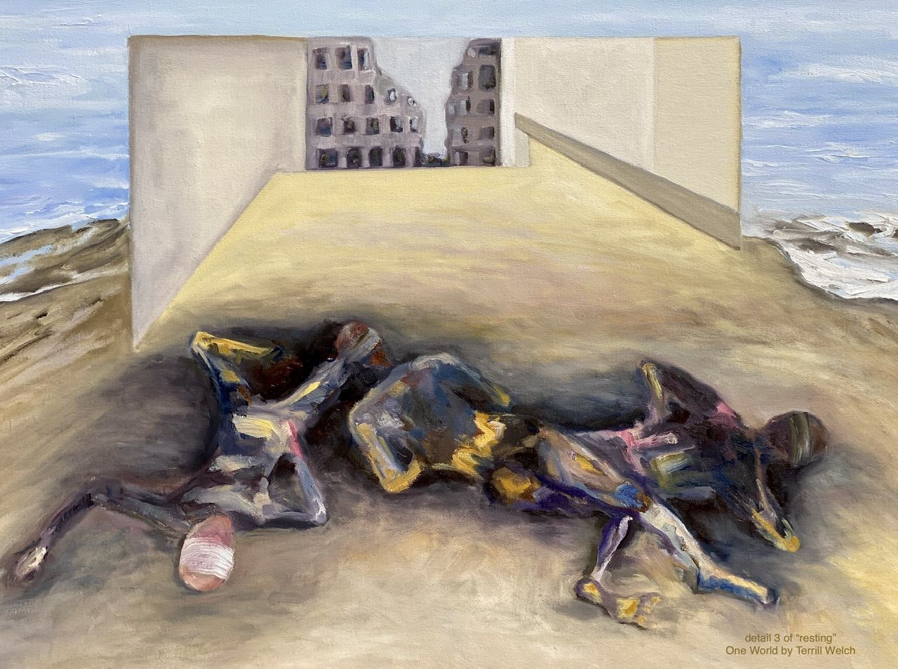 During early April 2022, war photographers began releasing images of Bucha Ukraine following Russia's retreat. The inhumane atrocities were nightmarishly haunting. I was overwhelmed by the graphic realty of sickly human behaviour. I went from our calm, warm, cozy home to the shores of the Salish Sea on the southwest coast of Canada where Mount Baker loomed across the waters in the United States. What if our neighbouring country were to attack us in this way? What would we do? These lands too have witnessed atrocities by European settlers towards Indigenous communities. There is no place of virtue for how despicable humans can be to one another. The miracle might be that we have even moments of peace, compassion and caring at all. Yet, the seascape from my island home is tranquil and takes the edge off of my inner turmoil. I return home and paint “One World, Two Places” using several partial references and my imagination. This painting is not yet released because it is one of my references for the large canvas I am working on now.