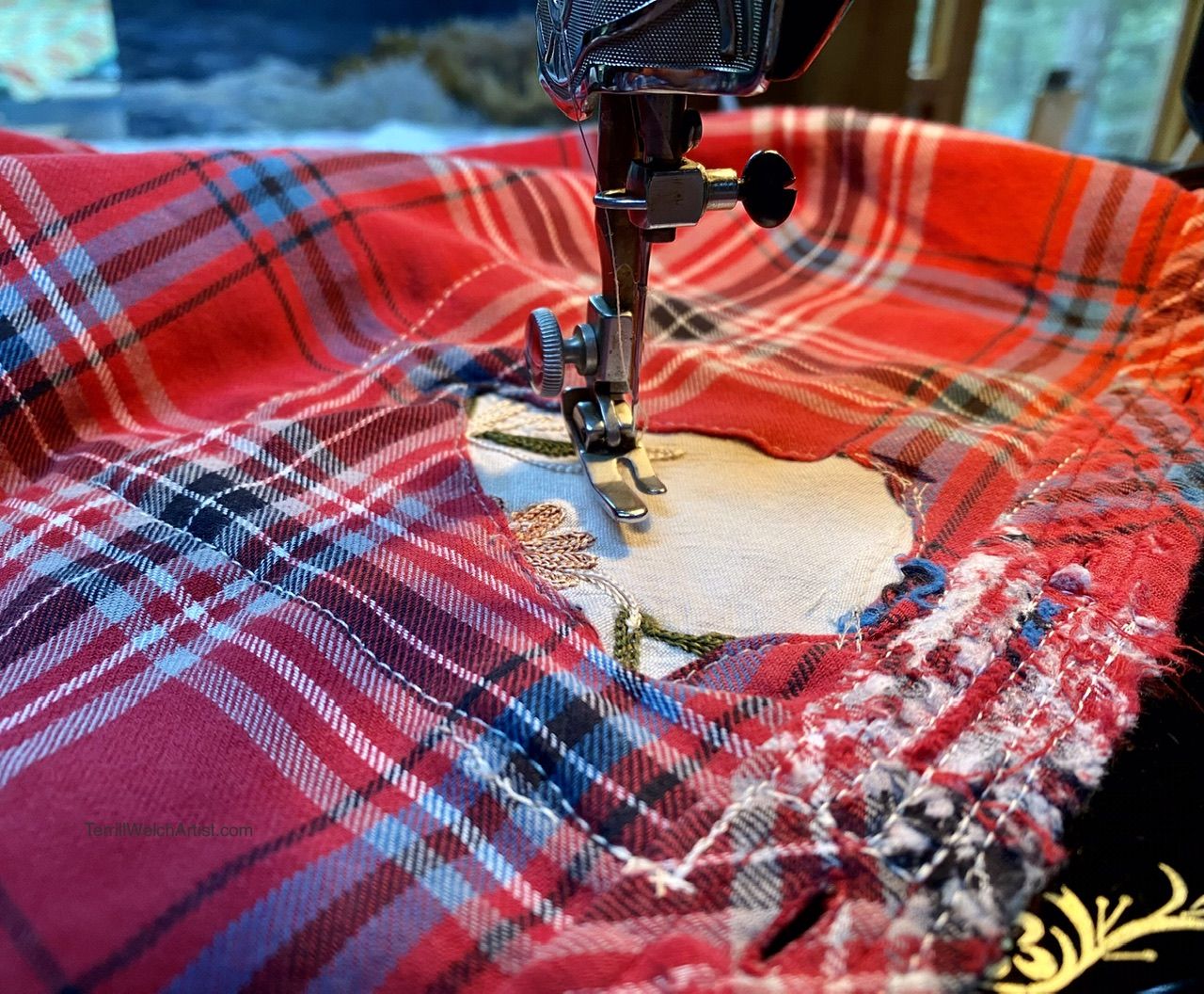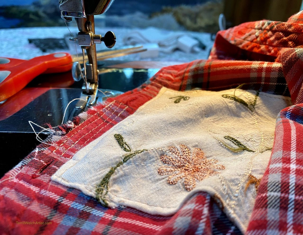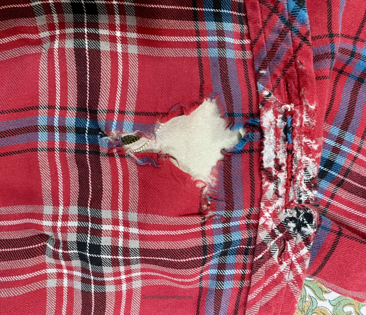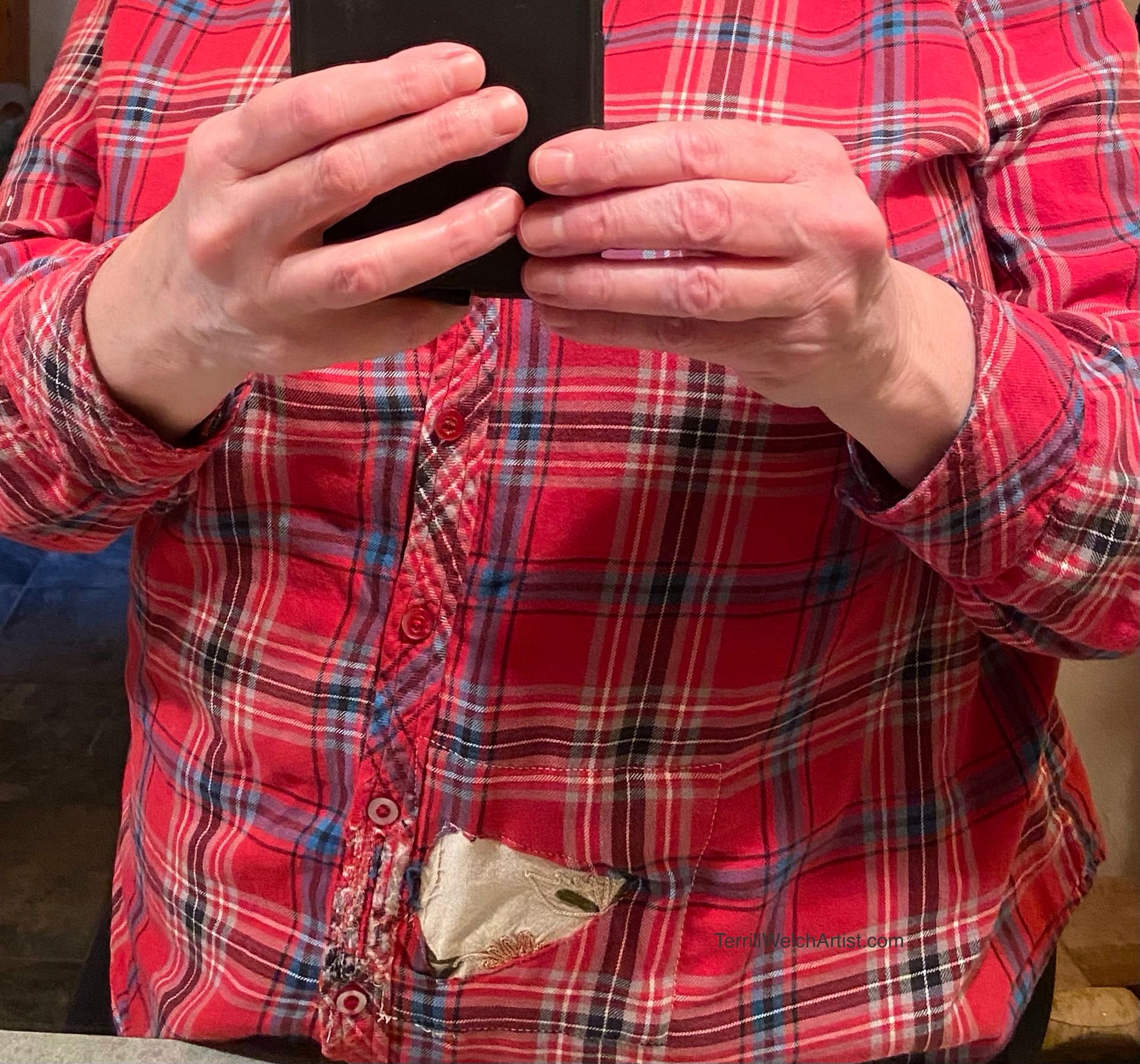 My favourite soft, red, plaid shirt had gone from everyday wear to a painting shirt about a year ago. The front that rubbed up against the kitchen sink and my seatbelt was wearing through even the interface underneath. A corner at the front had caught on my plein air easel and torn a while back. Truly there isn’t much left that isn’t worn and tattered. However, I am simply not ready to cut it up into painting cloths. Not yet.