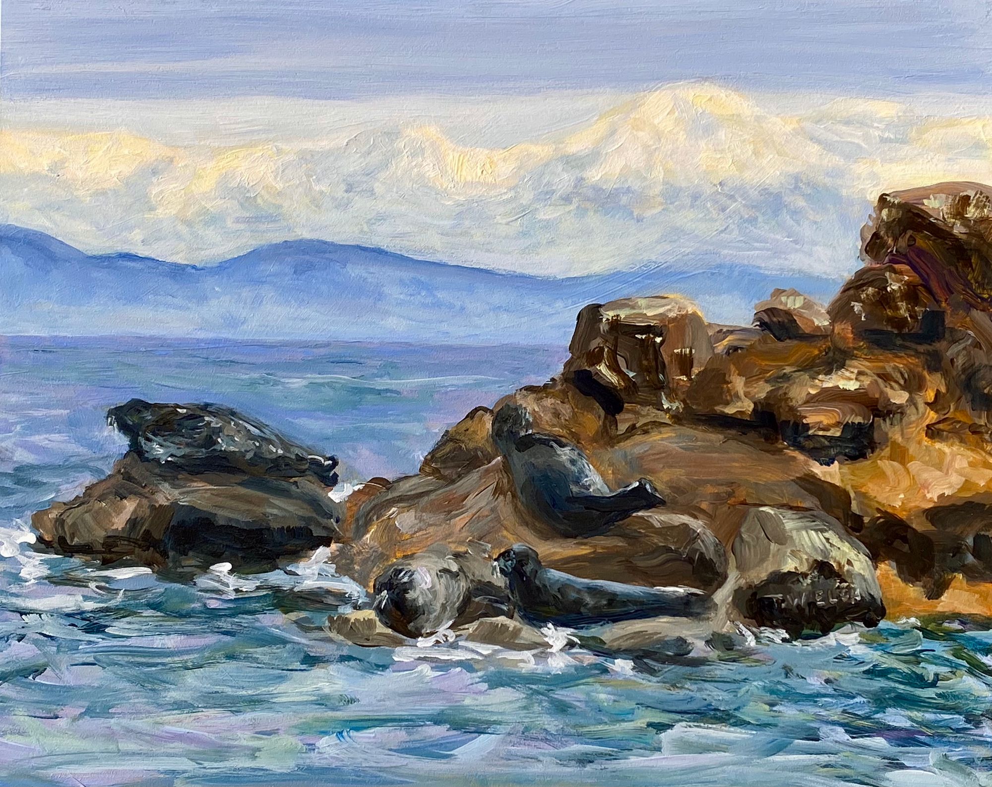 Artist notes: The high tides bring the seals close to shore at Oyster Bay. Their sleek shapes blend into the rocks sometimes going unnoticed until they move. Worthy of a quick sketch just for fun.