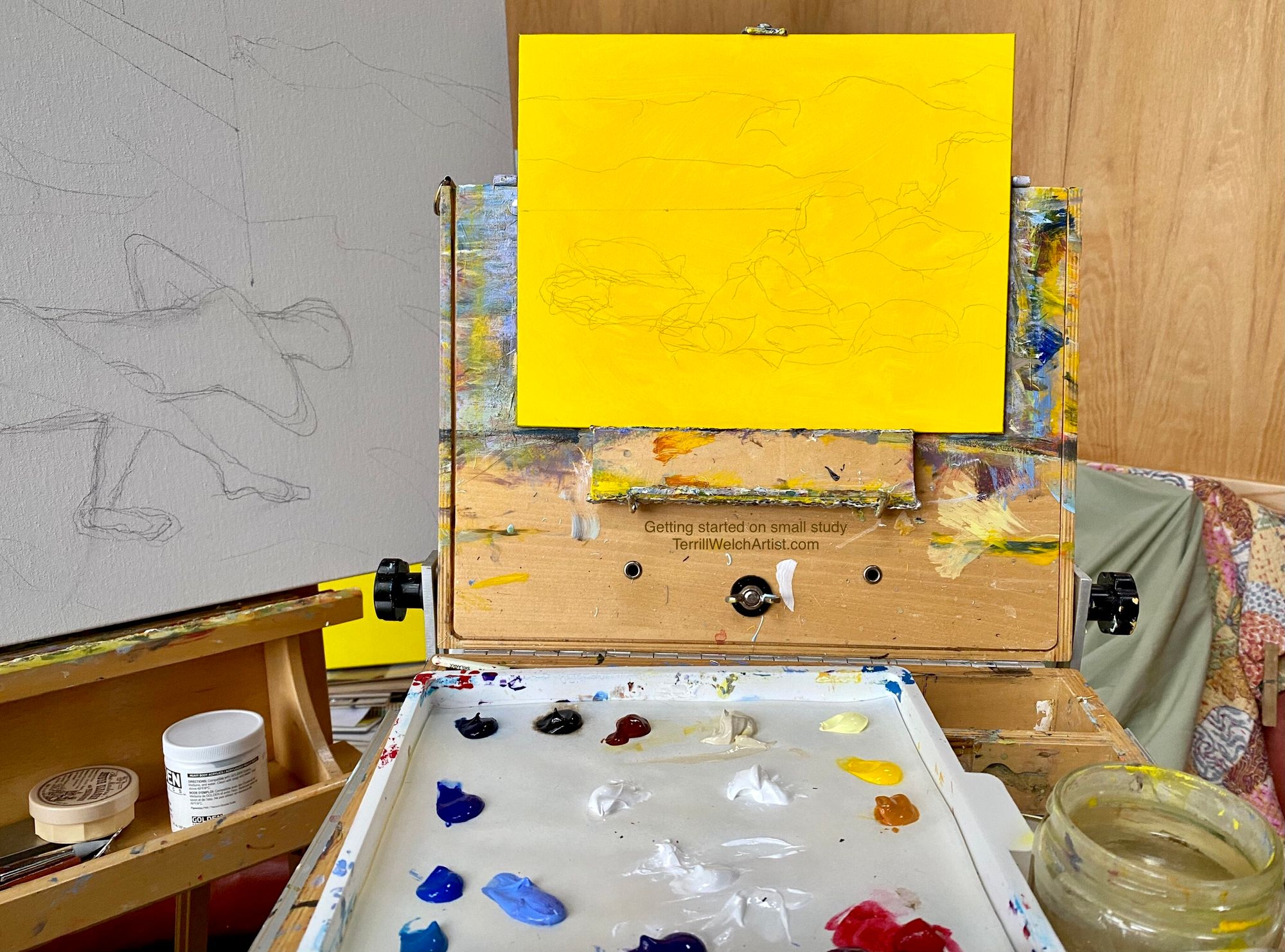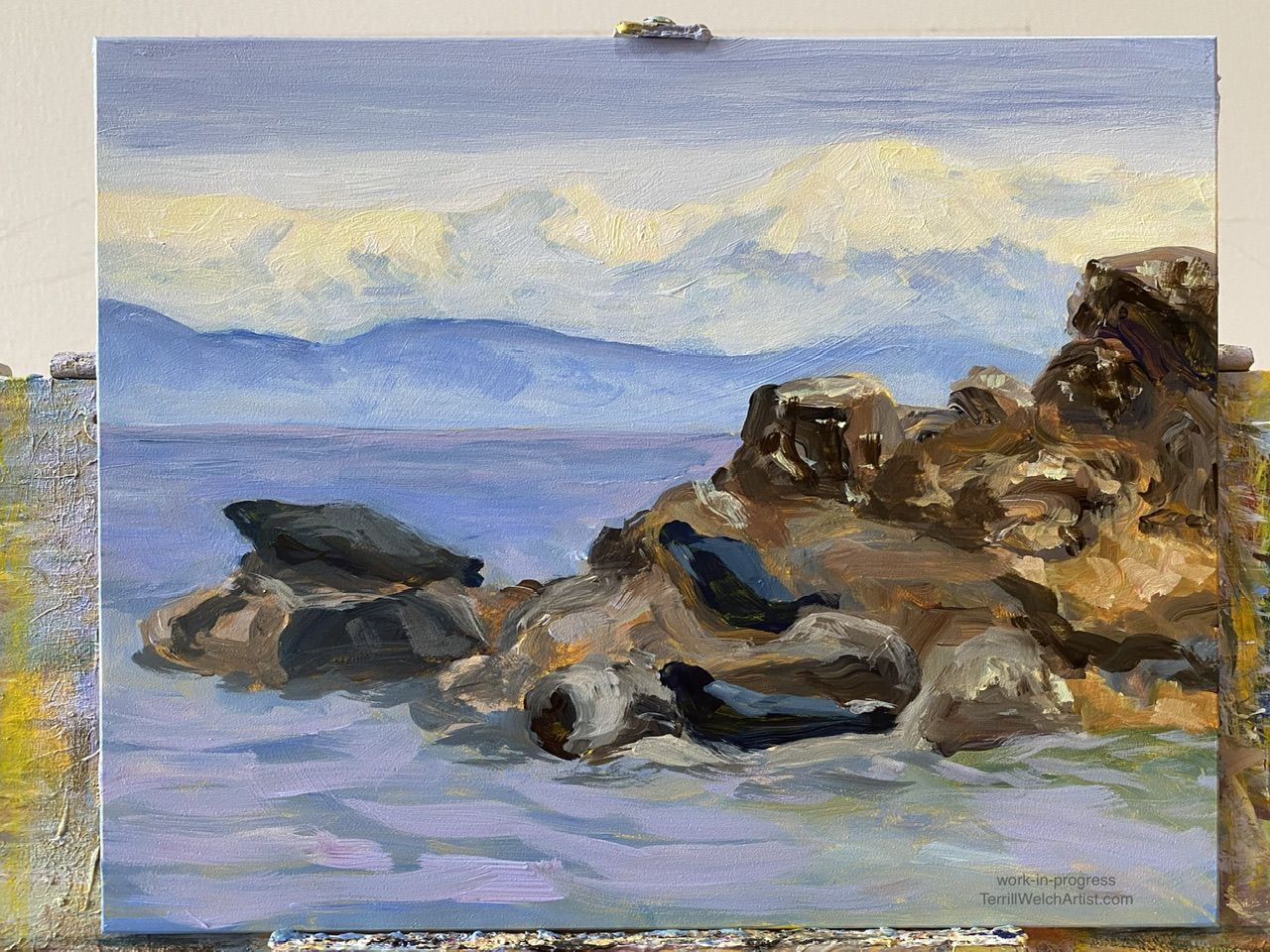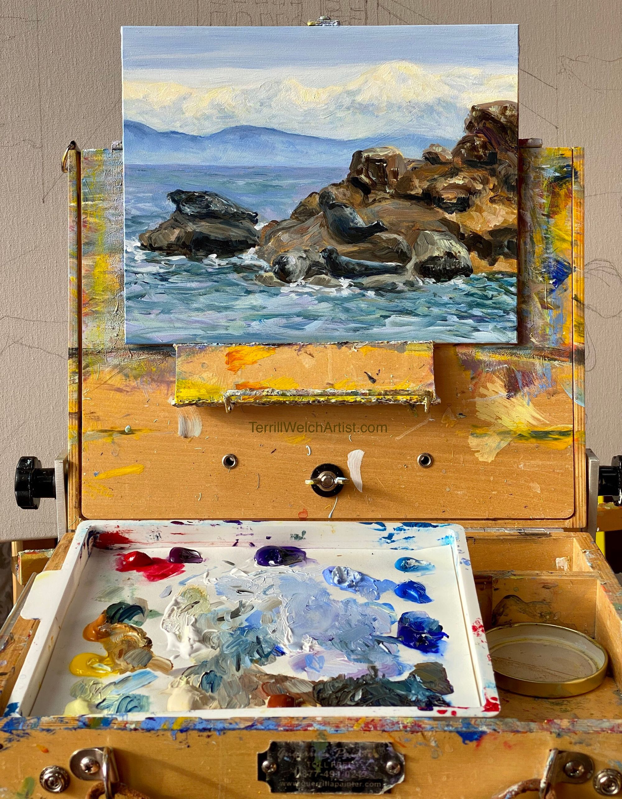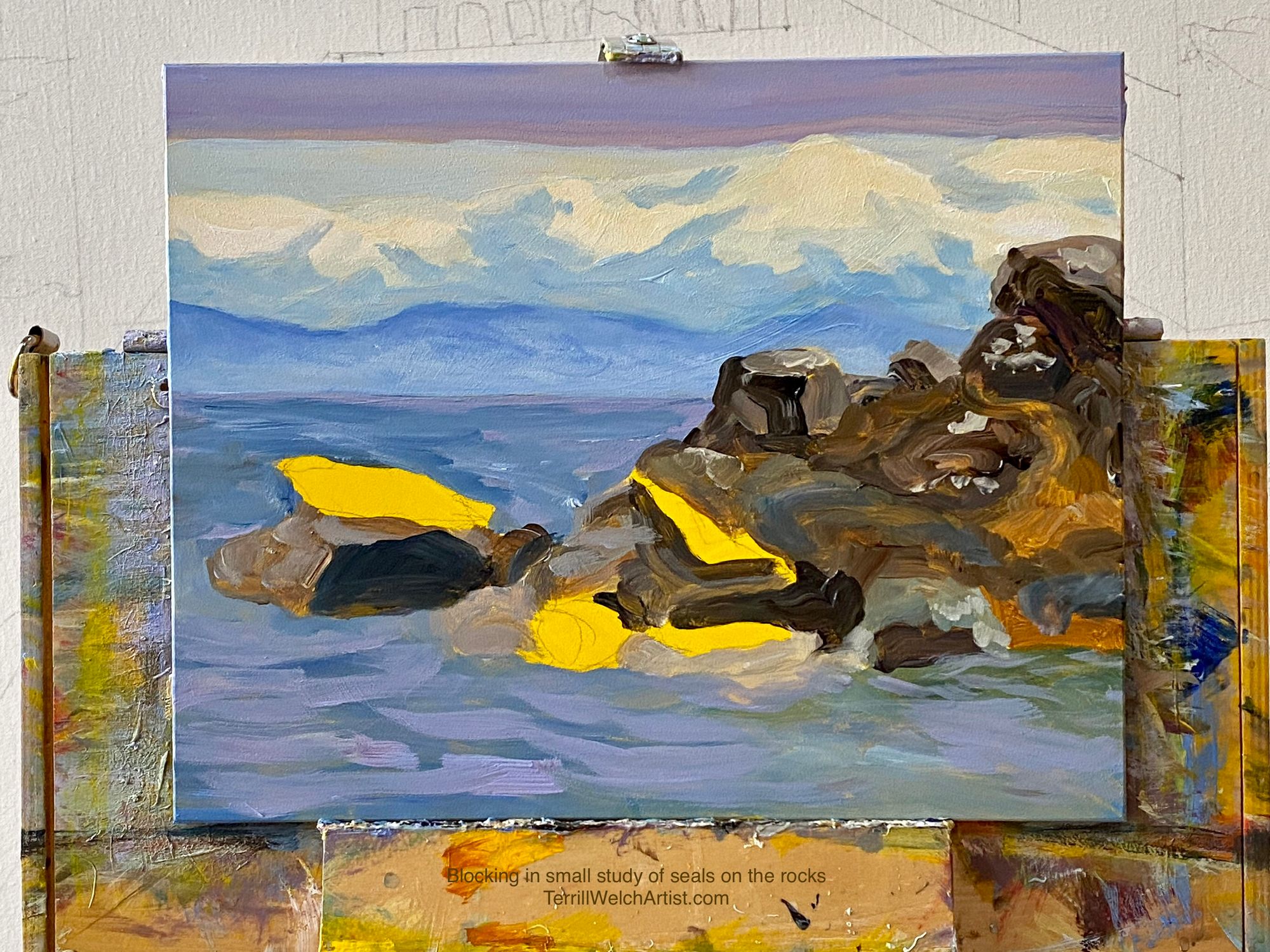 We will get to this canvas soon enough. First, let’s take on an easier subject such as seals on the rocks at Oyster Bay. You may remember the reference image for this small study sketch below from the last Terrill Welch by herself issue. When I was feeling like I just wasn’t able to yet put paint on the large canvas for my other subject, I chose these seals and placed my small gessobord on my plein air easel right in front of the large easel with its still white canvas with a few pencil markings.