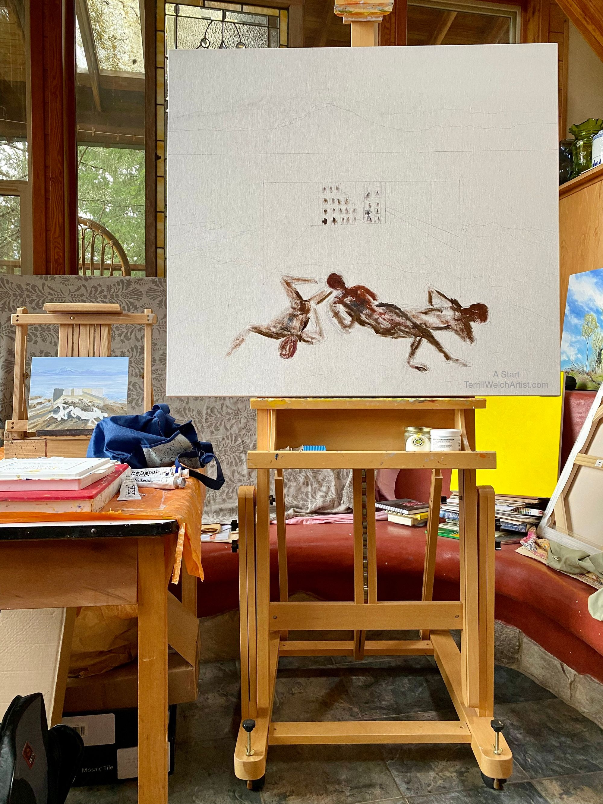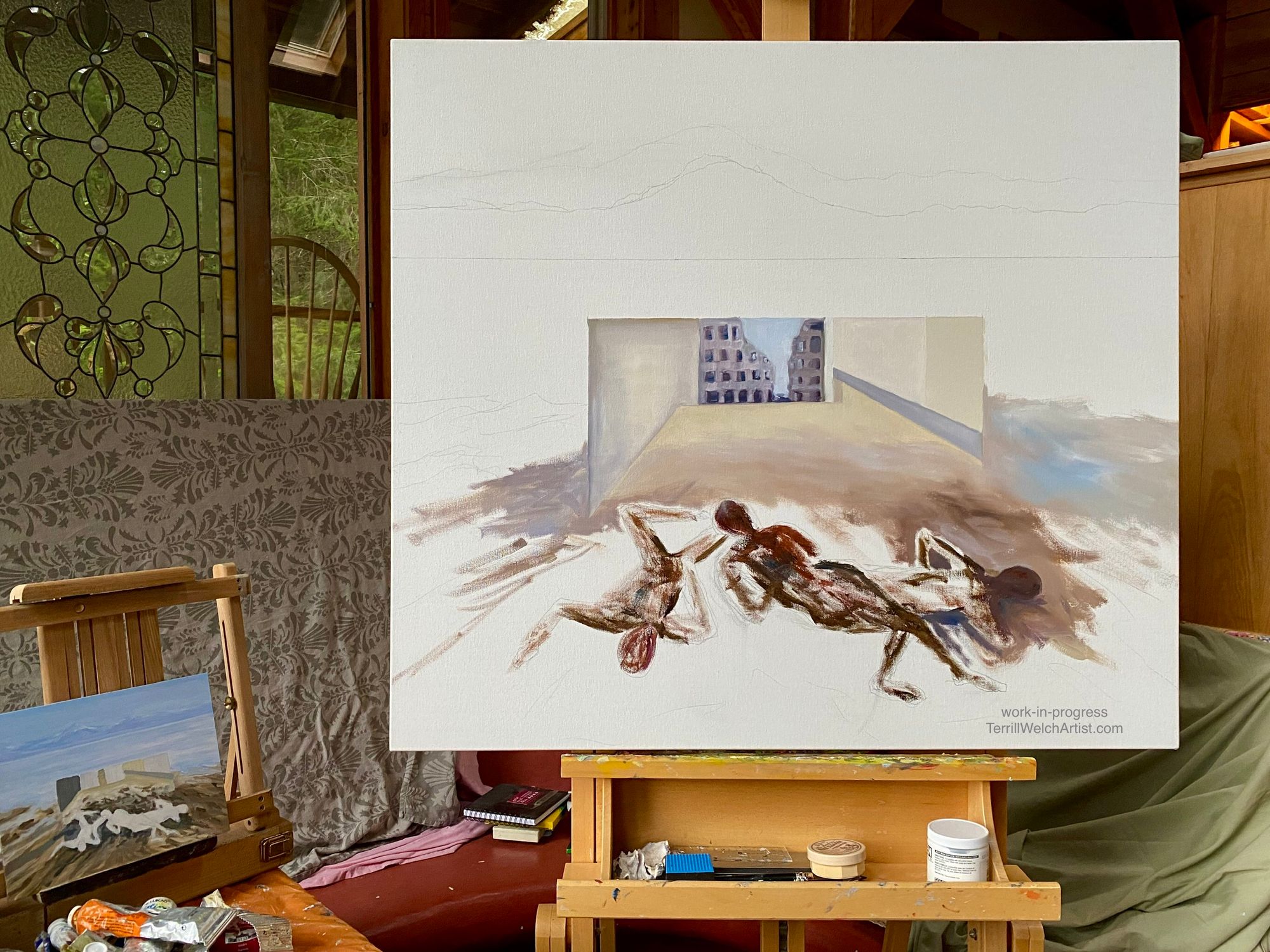 Therefore, my paintings on the subject are a way to pause and go deeper into our human condition as I grapple to place these circumstances into a shifting context. This is what “Thriving in Place” allows and encourages. Maybe this is why I have chosen our smaller paid subscriber group to share them with first? Possibly, I am unsure of the paintings yet. Possibly, I am unsure if I have a right to paint such things. Yet, some paintings need to be painted regardless of how unsure I might be. For now, this painting sketch and blocked in painting are being held for viewing within this contained of Terrill Welch by herself space. Hopefully, you can stay with me while I work through this and any other future emotionally and psychologically challenging paintings.