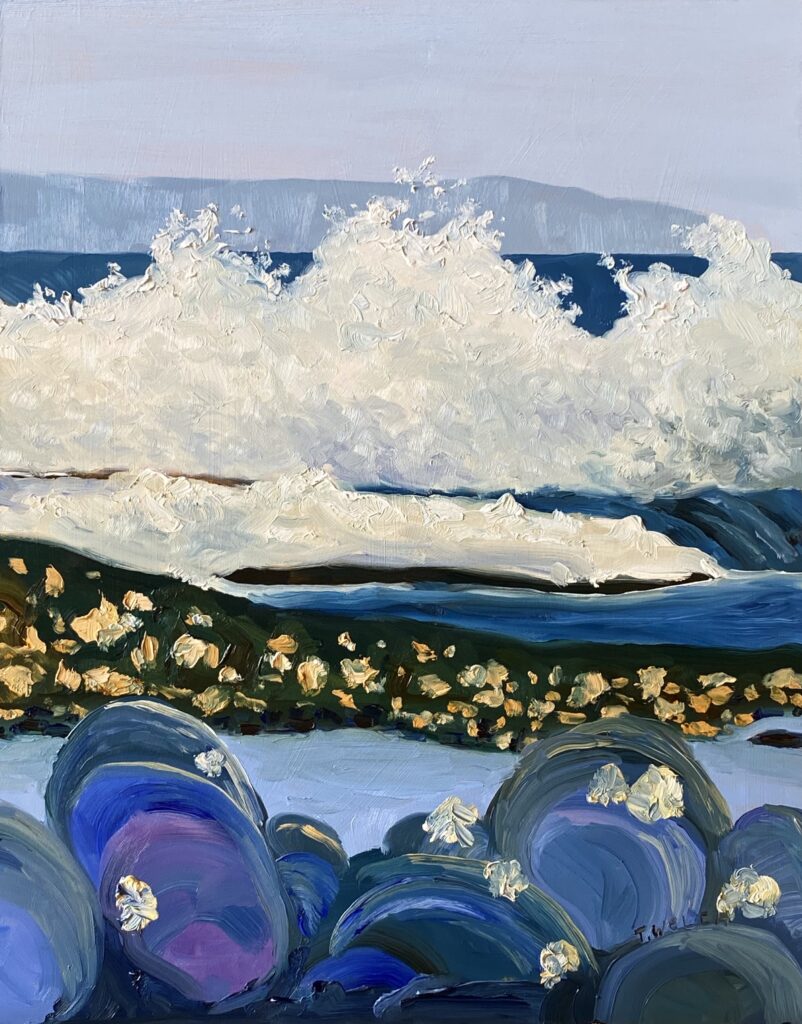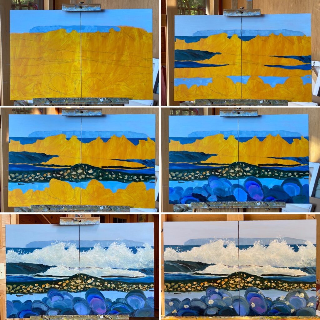 I began this painting wet on wet over a yellow acrylic ground at around 10:30 am and worked straight through to just after 2:30 pm. I found the subject hypnotic. Though I worked standing up walking back and forth as usual and I had to move the easel into the great room to avoid the sun in the studio, the painting didn’t let go of me until the end. This kind of deep emergence into my painting process is not unusual. The composition is constructed and though I had references they were more encouragement than resources. I relied instead on my memory of the sound of the sea, the warmth of the sun on my back and the smell of seaweed and mussels that are exposed during a low tide. These moments are invigorating and release stored energy in my whole sensory system. I still had access to all of this from the winds two days before and I used it.