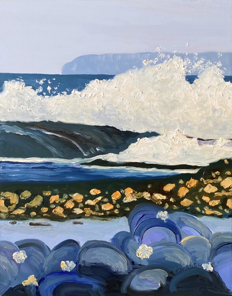 A northwest wind picked up the sea and tossed it over the sandstone reefs in the bright September Sun. I gathered up a spray of ideas and returned to the studio. Blowing troubles into washes of seaweed covered oyster shells while curving over mussels and then settling into the tidal pools of possibilities. Figurative yes. Abstract in shapes and an imagined composition. Time and place resonate deeply within and between the surfaces. I decided on a diptych to capture the entangled layers of dramatic textured shapes and colours. This second painting of the same subject could only come into existence with the first but now they each can stand on their own or together.