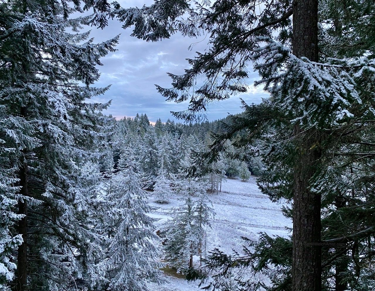 But the transition always feels expectant because it has the potential of being so much more and stunningly beautiful. Capitalizing on this potential, I have curated a selection of my southwest coast snow paintings beginning with a similar view as above on a different snow day.